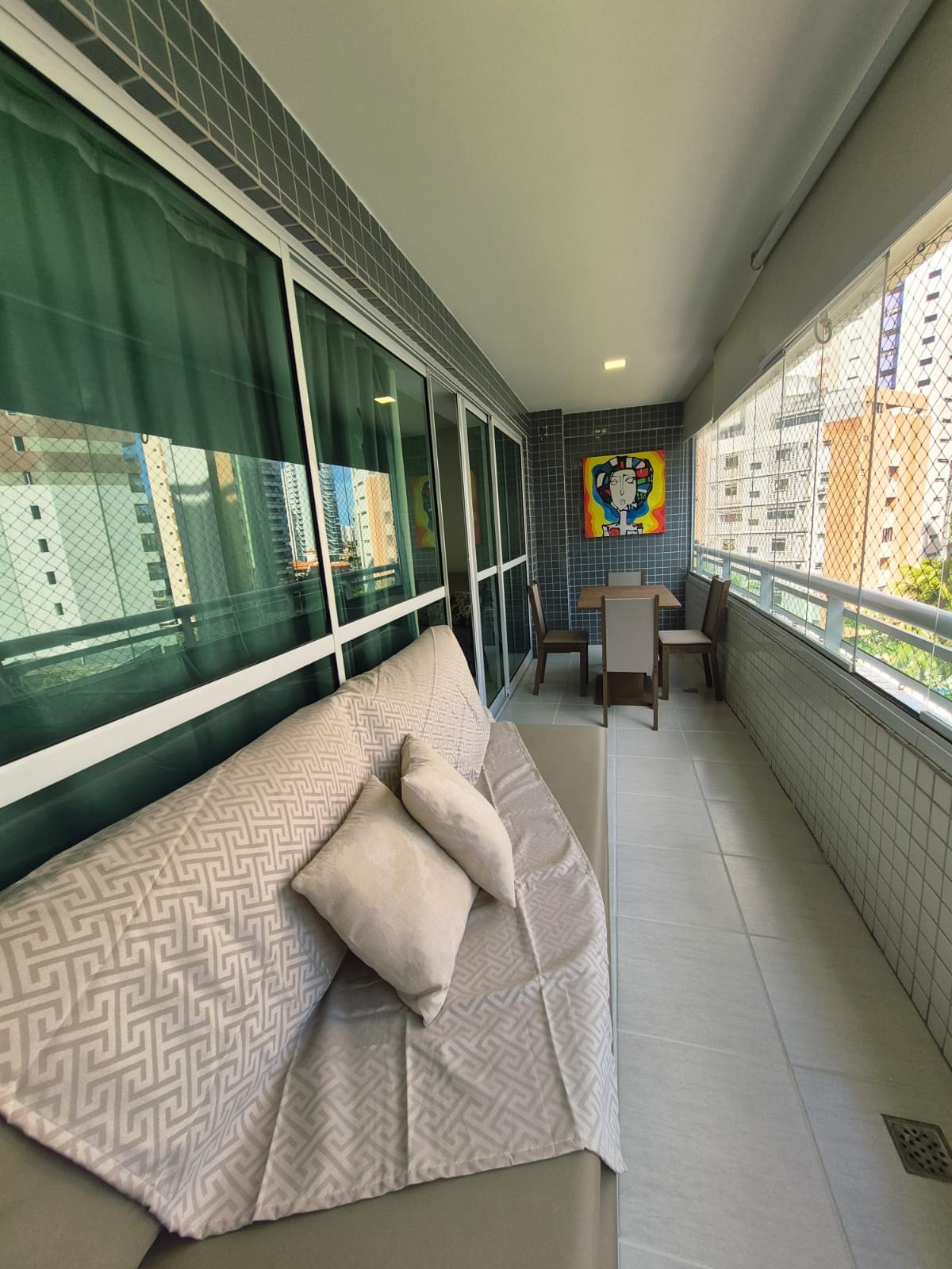 Apartamento estilo estudio (habitaciones integradas) con vistas al mar, ETT propio, 1 cama doble y 2 individuales, calentador de agua, red wifi, TV inteligente de 55”, red de protección en el balcón, secador de pelo, microondas, airfryer, cafetera, lavadora, etc. En las zonas comunes tenemos gimnasio, mercado y piscina con una vista espectacular. Cerca de puntos turísticos (Puente de los Ingleses, Mercado Central, etc.), supermercados, farmacias, bares y restaurantes. A 100 metros de la futura Casa Cor.