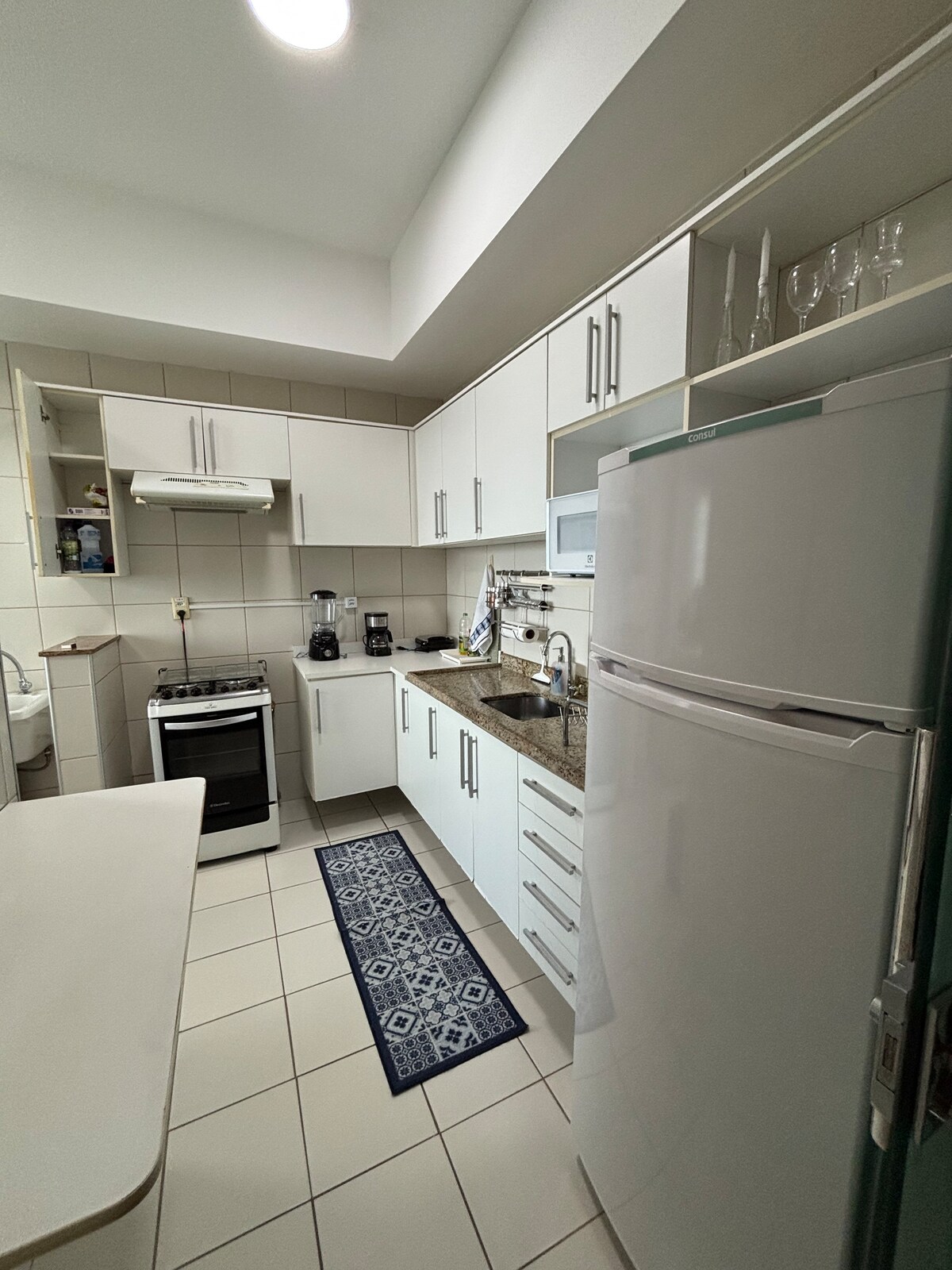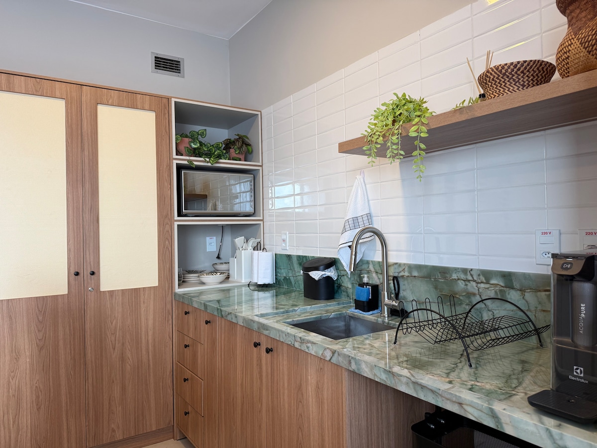 Piso en Tropical Executive Hotel bellamente diseñado con hermosas vistas al río. Habitación con aire acondicionado, una cama tamaño queen Ortobom, 1000 cables, TV de 45pulgadas, wifi, mesa de comedor de 2 plazas y sofá. Cocina bien equipada con 2 cocinas bucales, fregador, purificador de agua, cafetera Dulce Gusto + cápsulas, sartenes, licuadora, nevera, vajilla, utensilios de cocina y microondas.