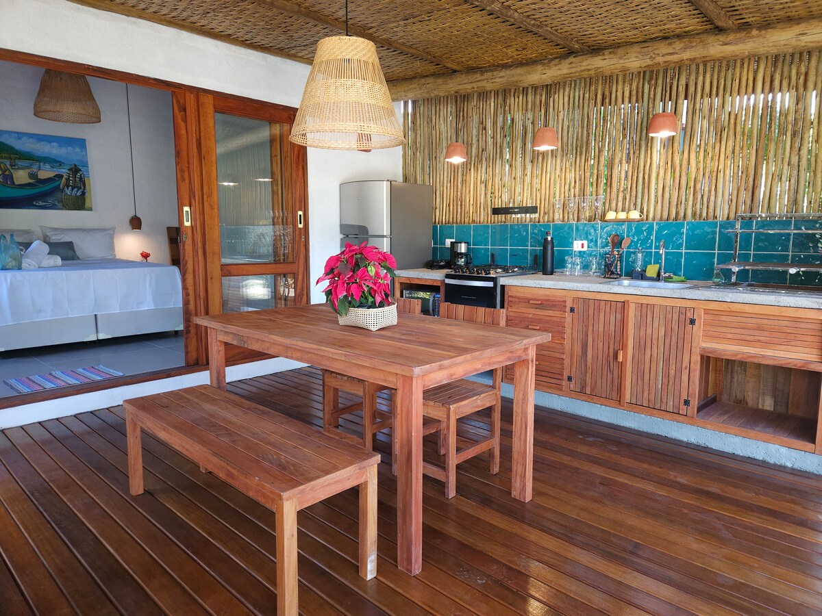 Charmosos estúdios self catering na linda praia do Prumirim. Entrada independente, pátio privado, cozinha totalmente equipada, cama queen size de alta qualidade, sala de estar confortável. Tudo projetado com qualidade, conforto e estilo. Grandes janelas panorâmicas que vão fazer você se sentir entre as copas das árvores! Este é um lugar mágico para quem procura uma fuga romântica à beira-mar conectando-se à natureza sem comprometer seu conforto. Tudo meticulosamente limpo, sanitizado e seguro!