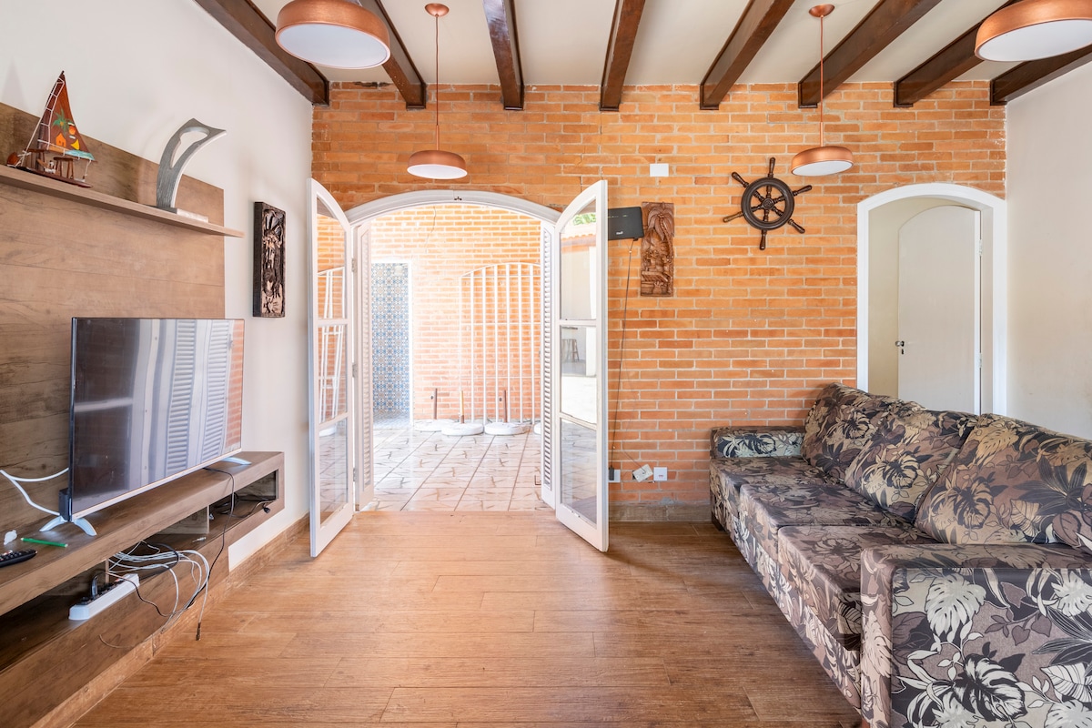 Casa en condominio, recientemente reformada con excelente ubicación. La casa tiene garaje para dos vehículos con plaza de aparcamiento cubierta y uno con plaza de aparcamiento abierta, una gran área con barbacoa, dos amplios dormitorios equipados con ventilador de techo, baño, sala de estar con TV de alta definición y cocina americana completa. Está a unos 100 metros del mercado principal del barrio y de la panadería Jureia. Cerca de varias cascadas, el río Guaraú (a tres minutos en coche) y la playa (a menos de dos minutos en coche)