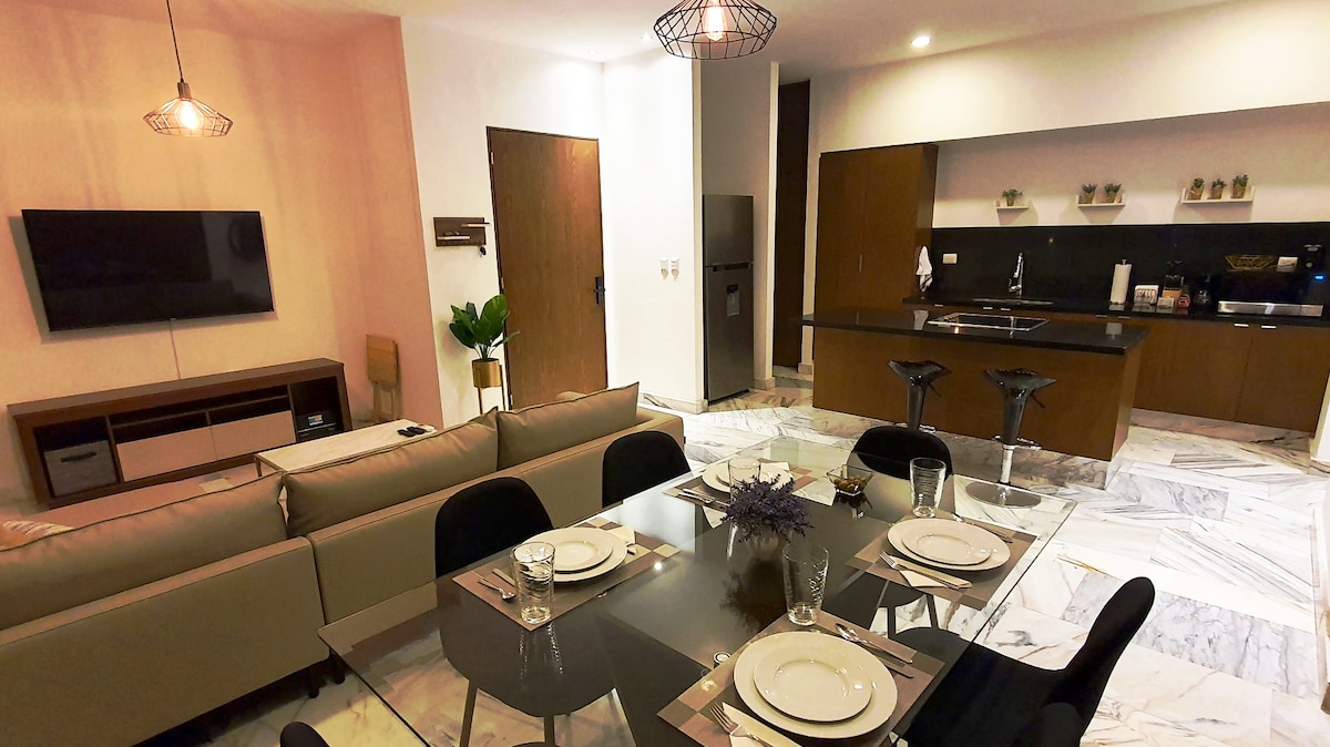Descubre nuestro moderno departamento inteligente de una recámara, ideal para 2 personas y hasta 4 huéspedes. Cuenta con cocina equipada, 1.5 baños, sala y comedor. Solo di “OK Google” para encender las pantallas, el ventilador, el aire acondicionado y la música. Ubicado en Bosqüa, un desarrollo privado cerca del centro de Mérida y con fácil acceso a Puerto Progreso. Es ideal para trabajo remoto. Ofrecemos auto check-in a partir de las 3 pm y vigilancia 24/7 para tu tranquilidad.