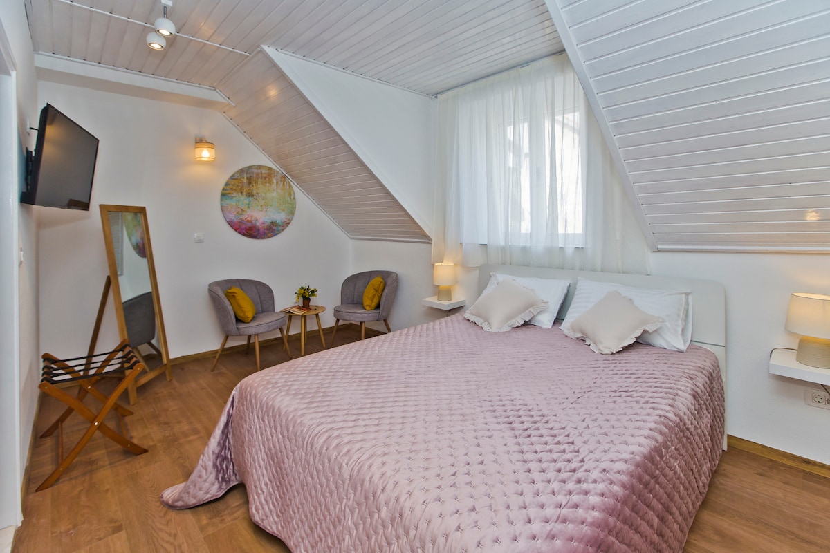 En la parte superior de una casa de 137 años en el ático hay un apartamento. Lugar que parece un nido con vistas únicas a Hvar Pjaca (Plaza), Riva y el puerto. Es perfecto para una pareja de luna de miel o simplemente para disfrutar de unas fabulosas vacaciones con un máximo de tres miembros de la familia.