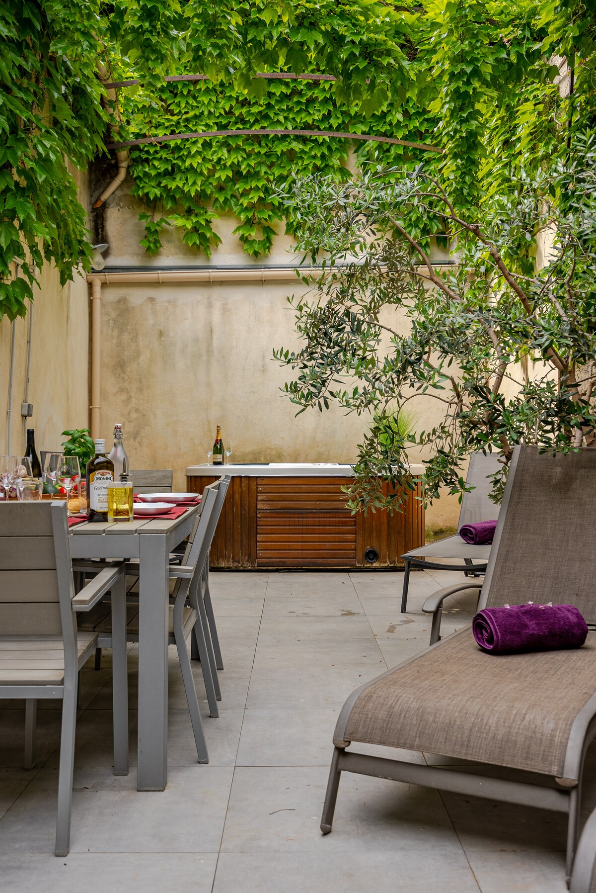 Le Patio Carreterie: Our hidden and lovely 120 sqm air conditioned townhouse is ideally located in the historical district of the city, inside the city's old walls. Its large and secluded patio garden enhanced by a jacuzzi will be the key to your comfort and relaxation during those lovely sunny days or Provençal evenings.