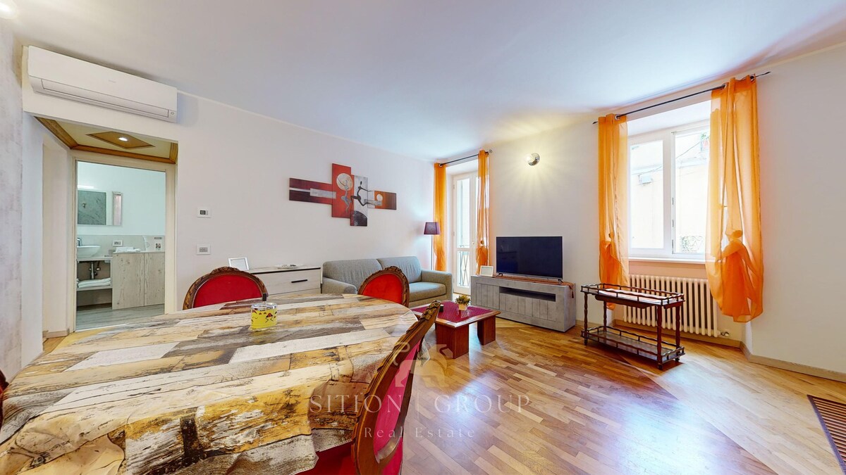 Un apartamento amplio y luminoso en el cuarto piso de un elegante edificio en el centro de la ciudad, con vistas directas al paseo marítimo de Omegna. Amplio recibidor, cocina, sala de estar y comedor con acceso a la terraza con maravillosas vistas panorámicas, 2 amplios dormitorios, 1 baño y un balcón en la parte posterior. Un ambiente cuidado, organizado y muy cómodo, ideal para alojar a una familia o un grupo de amigos, hasta 5 personas, incluso para estancias largas.