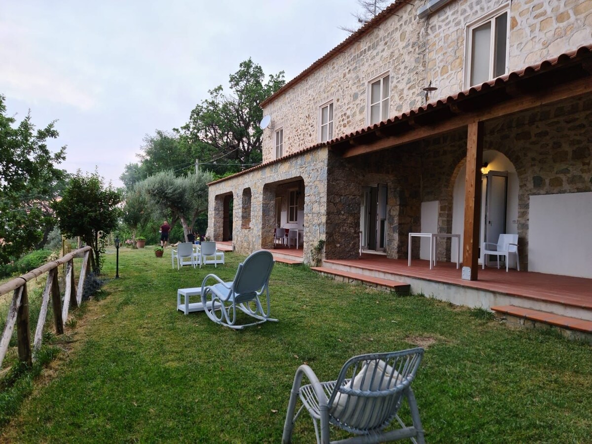 casale completamente immerso dal verde circondato da colori e profumi tipici ella macchia mediterranea ..sulla collina di Capaccio-Paestum nel Parco nazionale del cilento ,il sito archeologico di Paestum si trova a circa 15 min di auto. le camere,matrimoniali,luminose e finemente arredate ,dispongono tutte di ampio bagno privato con doccia e servizi,tv aria condizionata e frigobar e free internet wi-fi!Dal casale si possono fare bellissime passeggiate nei dintorni,raggiungere il centro storic