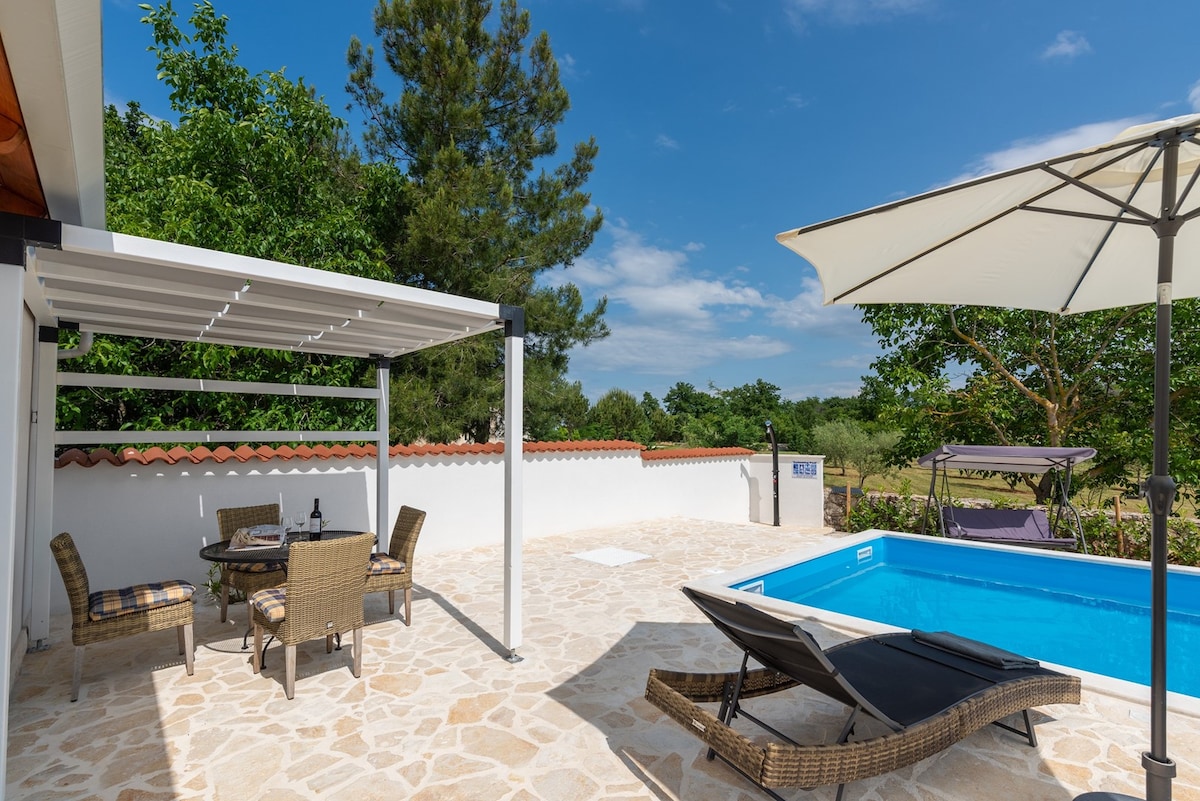 Grijani vanjski bazen rezerviran samo za vas i prostrana moderno uređena villa idealna je za vaš novi obiteljski odmor. Savršena je za 4 odrasle osobe. Prostrana i funkcionalno opremljena kuhinja i veliki dnevni boravak s direktnim izlazom na bazen i terasu s mobilnim krovnim lamelama dati će vam osjećaj luksuza i komfora. Na raspolaganju su i 2 spavaće sobe s velikim krevetima 1,8x2 m i privatnim kupaonicama. Za rashlađivanje se brinu 3 AC. Besplatno parkiranje za 2 vozila u ograđenom dvorištu.