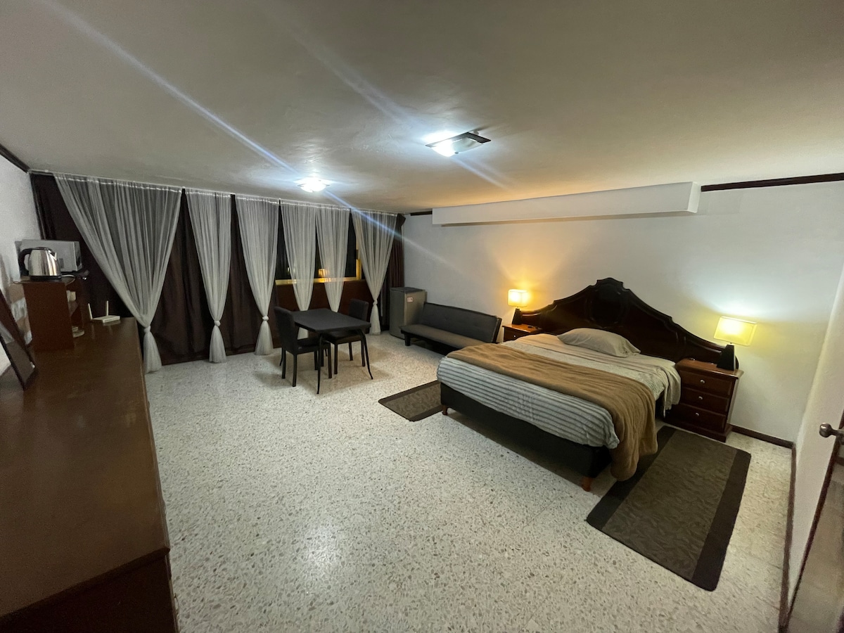 Esta habitación de muy amplio tamaño será ideal para tus vacaciones o viaje de negocios. Contamos con todas las amenidades para que estés a gusto. Cama king size, TV con servicios de streaming, internet rápido, estacionamiento, agua caliente, área de trabajo privada