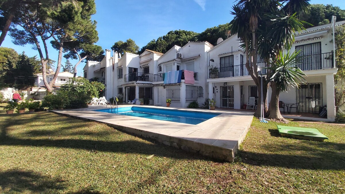 En la famosa Milla de Oro, entre la hermosa ciudad de Marbella y el vibrante puerto de Puerto Banús, encontrarás un pequeño oasis para relajarte. A solo 3 minutos a pie encontrarás una de las playas más bonitas de la zona con muchos bares y restaurantes. Puedes pasear por la playa hasta Puerto Banús o jugar al golf cerca en poco tiempo. La piscina solo se comparte con la otra parte de la casa adosada. Además, ¡te esperan una plaza de aparcamiento privado y una terraza!