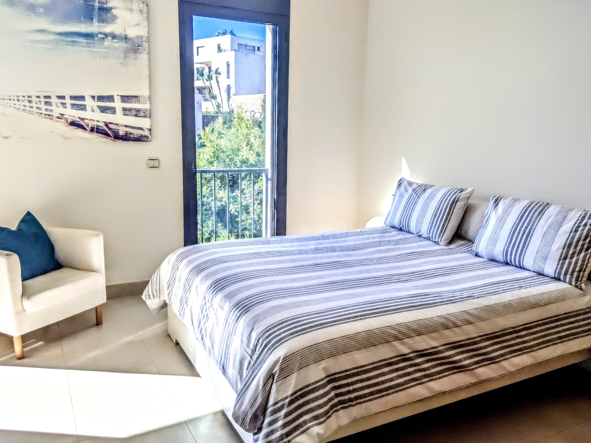 Het 80m² privéterras is wat gasten het meest waarderen — zon vanaf einde ochtend tot zonsondergang, met zowel zon als schaduw plekken en uitzicht op palmbomen en rustige resortzwembaden. Een stijlvol luxe 2-slaapkamerappartement in Marbella, op enkele minuten van Puerto Banús en slechts 1,5 km van het strand. Twee slaapkamers met eigen badkamer, airconditioning, privéparkeerplaats en een compleet uitgeruste keuken in een beveiligd complex — comfortabel en met zorg ingericht door StayatSas.