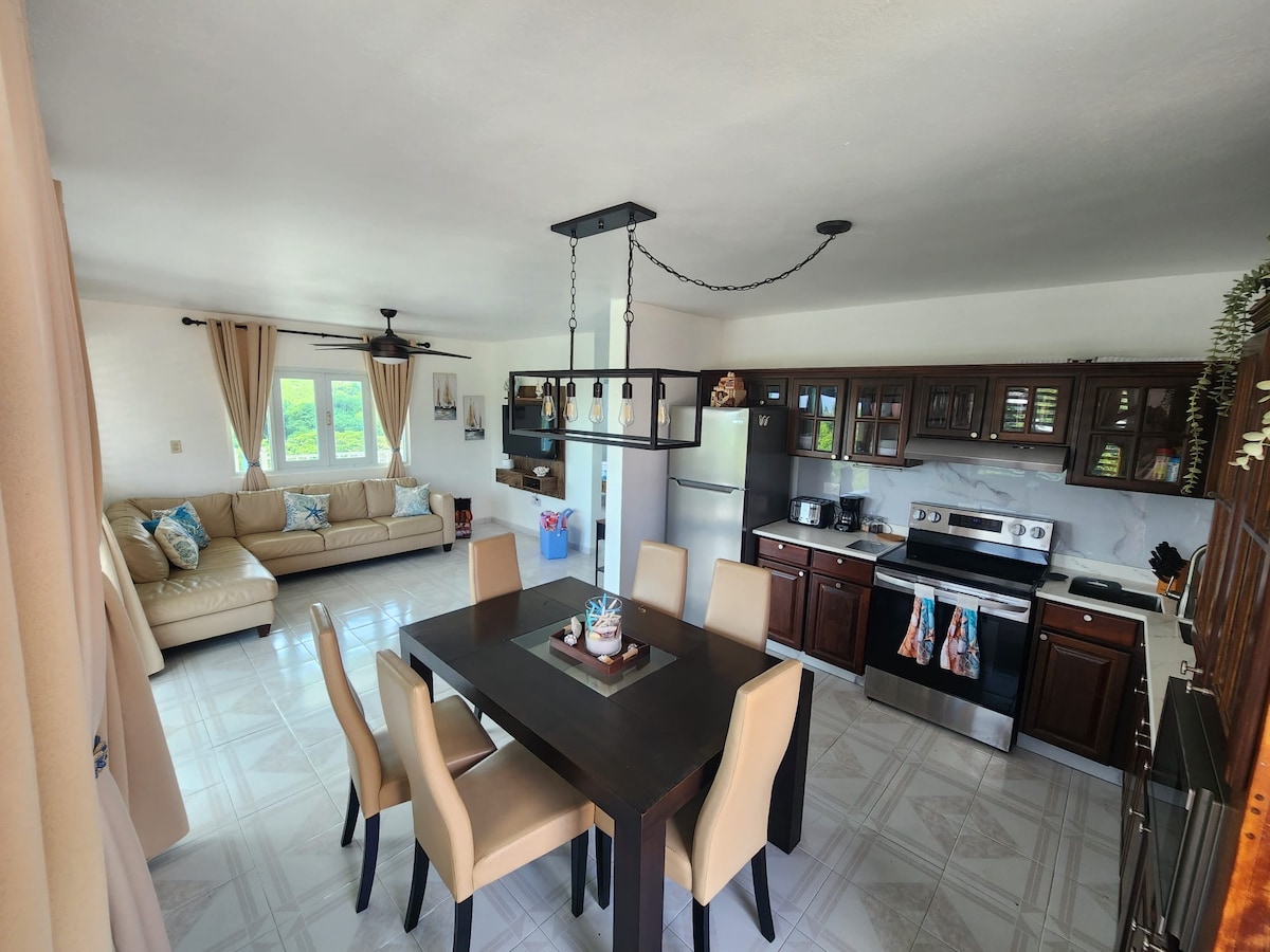 Disfruta del apartamento privado de la planta baja en nuestra casa de dos pisos. Cuenta con una cocina abierta completa, comedores interiores y exteriores, una cama tamaño queen en el dormitorio con aire acondicionado, un sofá que se convierte en una segunda cama y una ducha con agua caliente. Hay televisión inteligente. La entrada es privada y el estacionamiento está justo delante del apartamento. Se encuentra en Villa Borinquen, a 5 minutos en coche o a 25 minutos a pie de la estación de transbordadores y de las zonas de surf.