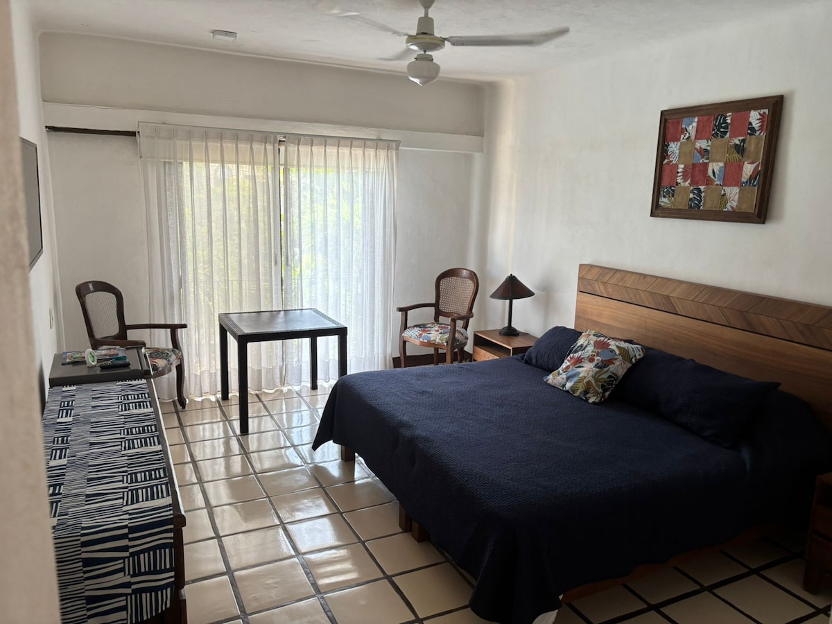 Bienvenidos a mi espacio, ésta es una habitación de 19.25 m2 completamente independiente, la puerta de la habitación da a la calle directamente, cuenta con regadera, wc, aire acondicionado, internet, cama queen size, mesa para dos personas, dos sillas, cafetera, secadora de pelo, horno eléctrico, plancha, tazas y platos para café. Está ubicada en una zona habitacional de Puerto Vallarta céntrica y muy cerca de la Zona Hotelera Norte. Viejo Vallarta y Playa Los Muertos están a 10 minutos en auto.