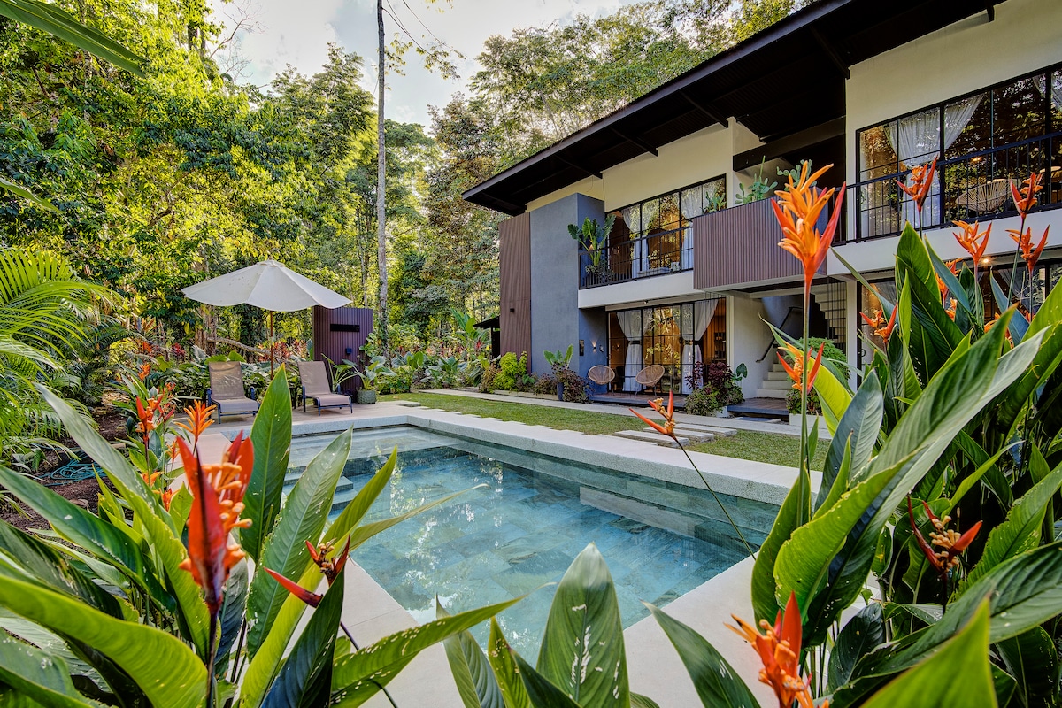 Unidad amplia, nueva, moderna y cómoda con entrada privada y aire acondicionado en todas las habitaciones. Piscina grande. Ducha al aire libre e interior con agua caliente. Cocina completa. A solo 5 minutos en bicicleta de la playa. Patio al aire libre. Disfruta de comodidades modernas en medio de un paraíso en la selva. Duerme con la relajante cacofonía de ranas y cigarras, y despierta con la energía de tucanes y monos. una ducha interior caliente, una ducha al aire libre, una gama de estufas de gas, pantallas en cada ventana y más.