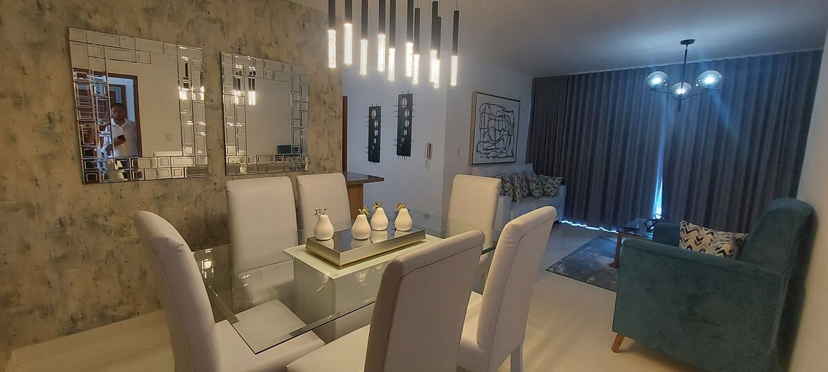 Diviértete con toda la familia en este alojamiento con estilo. Este encantador alojamiento está ubicado a 15 minutos del aeropuerto internacional de Santiago, a 4 minutos de supermercados, restaurantes. Está ubicado en el primer nivel del edificio D, ofreciendo 3 dormitorios; una con 2 camas twins con aire acondicionado y tv, una con 1 cama queens con AC y TV y una con una cama king AC y TV; sala, comedor, área de lavado, balcón y 1 parqueo. También cuenta con piscina y área de juego.