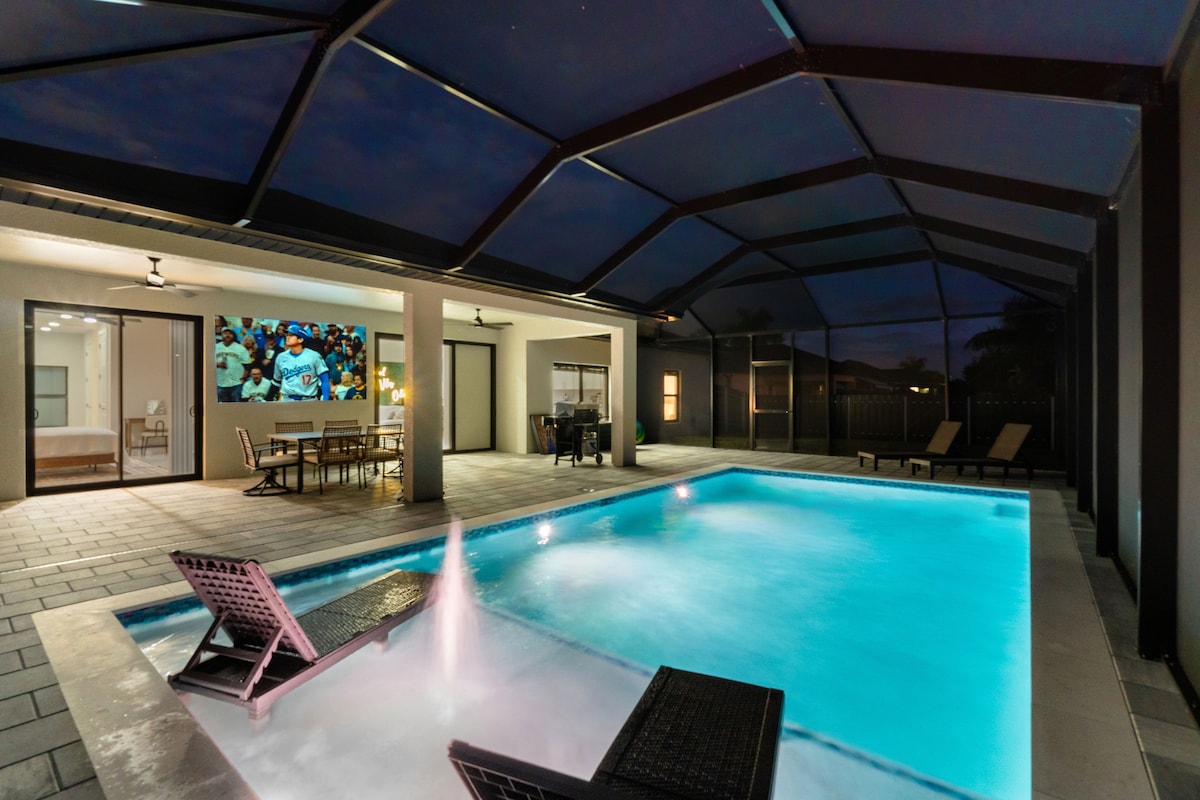 DESCUENTOS: Semanas... 1 = 10 %, 2 = 15 %, 3 = 20 %, 4 = 25 %. ¡Te damos la bienvenida al «Oasis»! ¡Escápate al agua y alójate en un canal en el hermoso Cabo Coral! Disfruta de esta casa de 3 dormitorios y 2 baños. ¡Nada en la piscina, siéntate en el patio, pesca desde el muelle, siéntate en el bar tiki para tomar una copa o echa una siesta en el lanai para escapar de todo! Hay un muelle de 50 pies de largo con 30 y 50 amperios, ¡así que trae tu barco! ¡Se puede acceder al golfo en barco y a las actividades y playas cercanas de Ft Myers Beach y Sanibel/Captive Island!