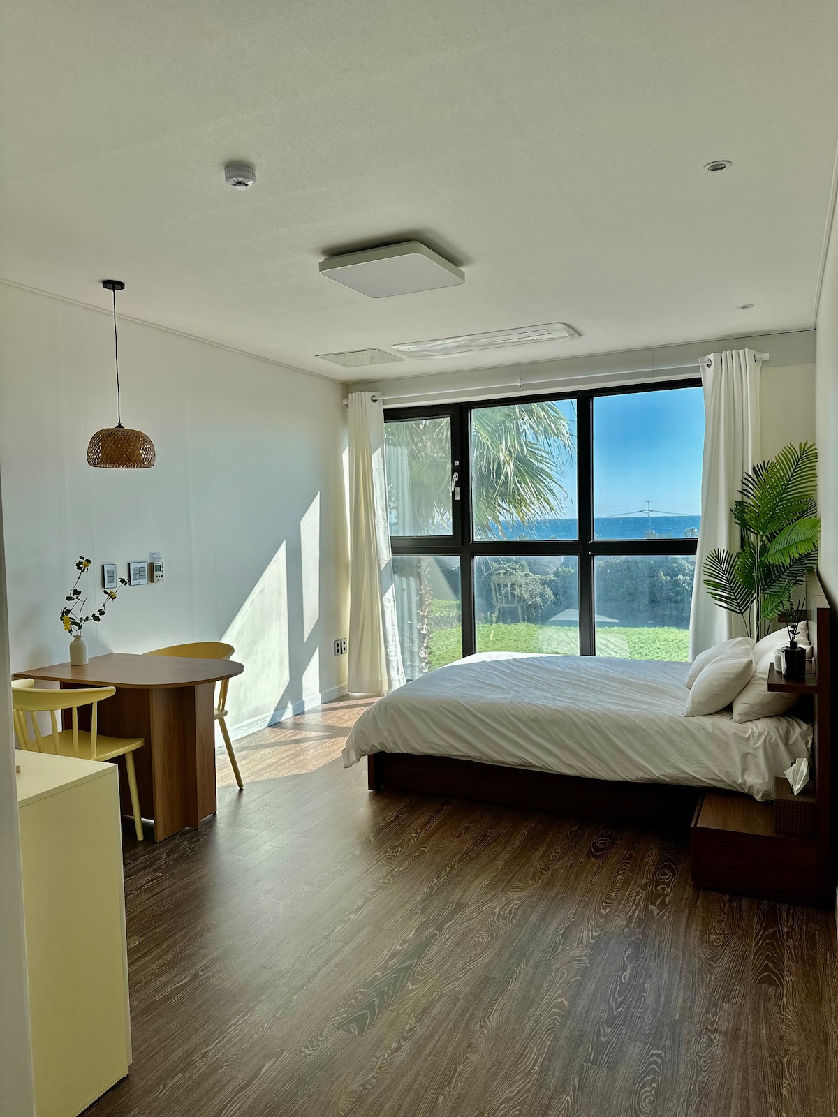 Es un alojamiento que tiene como patio delantero el misterioso mar de Jeju de color esmeralda.