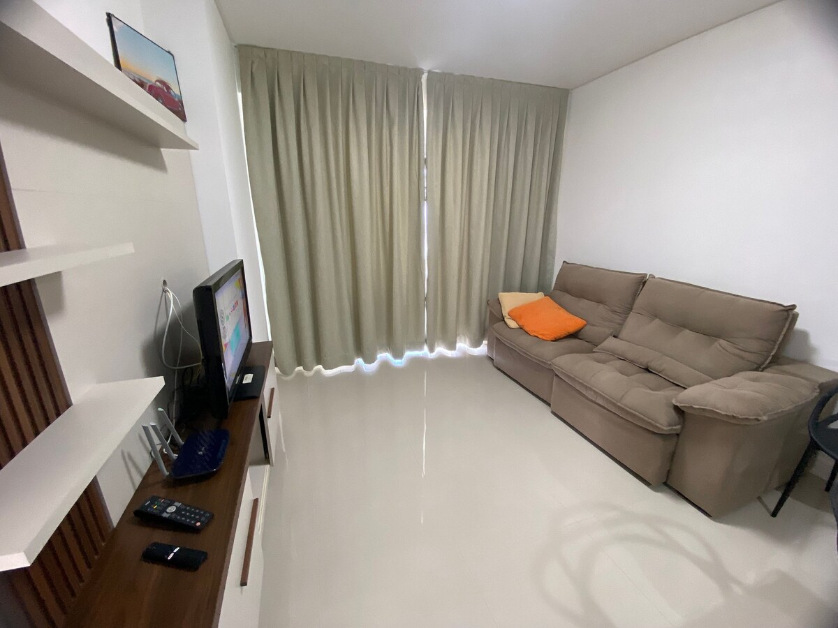 Lo pasarás muy bien en este cómodo alojamiento. Cuenta con piscina climatizada y abierta para adultos y niños, sala de juegos, cine, sala de SPA, gimnasio. Nuestro apartamento tiene 1 dormitorio con aire acondicionado (1 cama doble y 1 colchón individual) 1 baño social, cocina con utensilios, sala de estar con TV inteligente y aire acondicionado ( sofá cama) , balcón con barbacoa, área de servicio con lavadora.