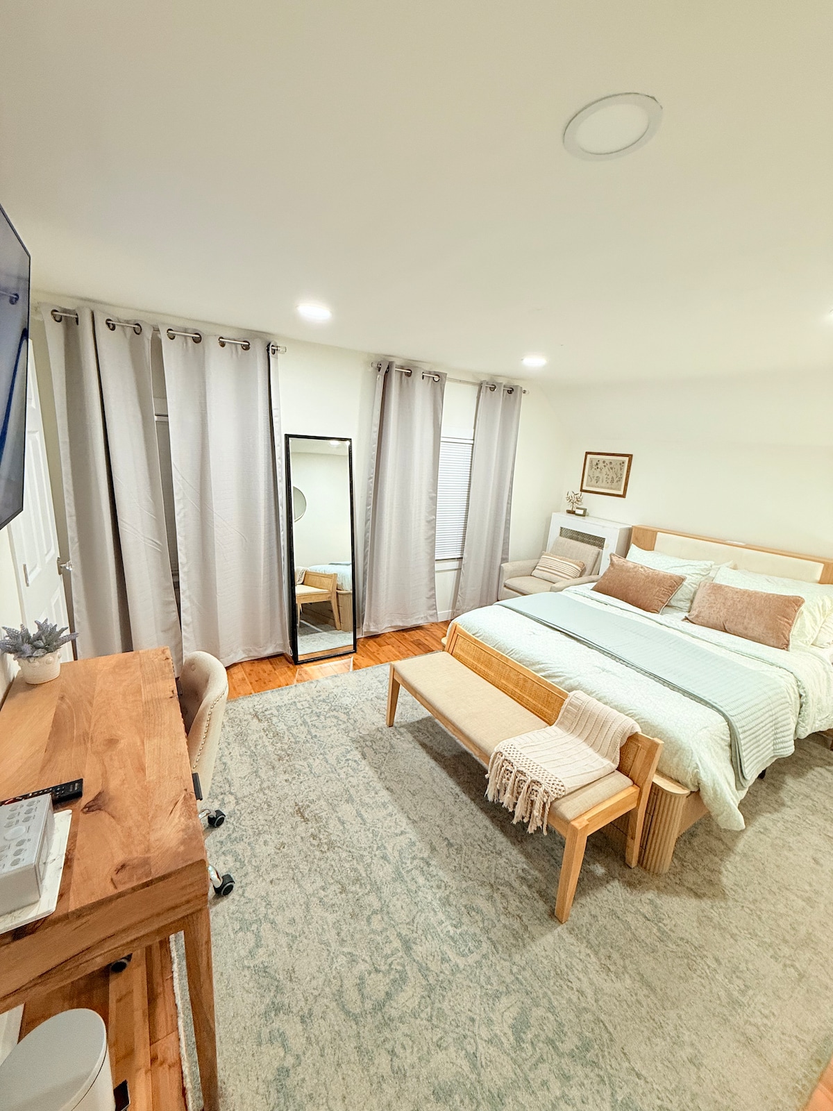 Este estudio de estilo Japandi cuidadosamente diseñado es perfecto para trabajar a distancia o disfrutar de una escapada tranquila. El espacio cuenta con una acogedora cama queen, un pequeño sofá y una zona de estar. Disfruta de Internet de alta velocidad, TV y un escritorio para la productividad. La suite incluye una pequeña cocina con nevera, microondas y cafetera. Situado en un barrio tranquilo y seguro, con acceso a una chimenea al aire libre en el patio trasero para relajarse. Ideal para una estancia tranquila, cómoda y productiva.