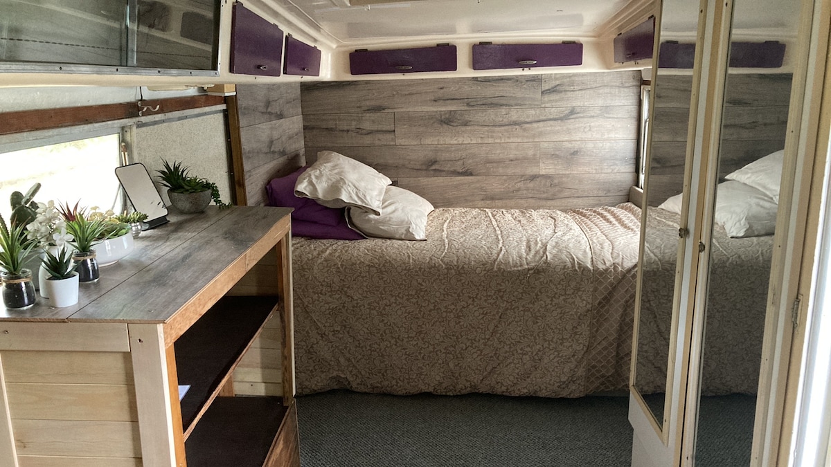 Retiro privado en caravana con vistas, comodidad e instalaciones. Quedate en nuestra acogedora caravana, ubicada en un lugar tranquilo, con mucho espacio a tu alrededor para que te sientas como si estuvieras en el medio de la nada. Una corta caminata de 30 metros te lleva a un baño compartido limpio con dos inodoros con descarga y una ducha con agua caliente. Ya sea que estés aquí para relajarte, explorar la propiedad o simplemente disfrutar de una escapada tranquila bajo las estrellas, nuestra van es la base perfecta para relajarte y recargar energías. Con calefacción para el invierno y ventilador para el verano.