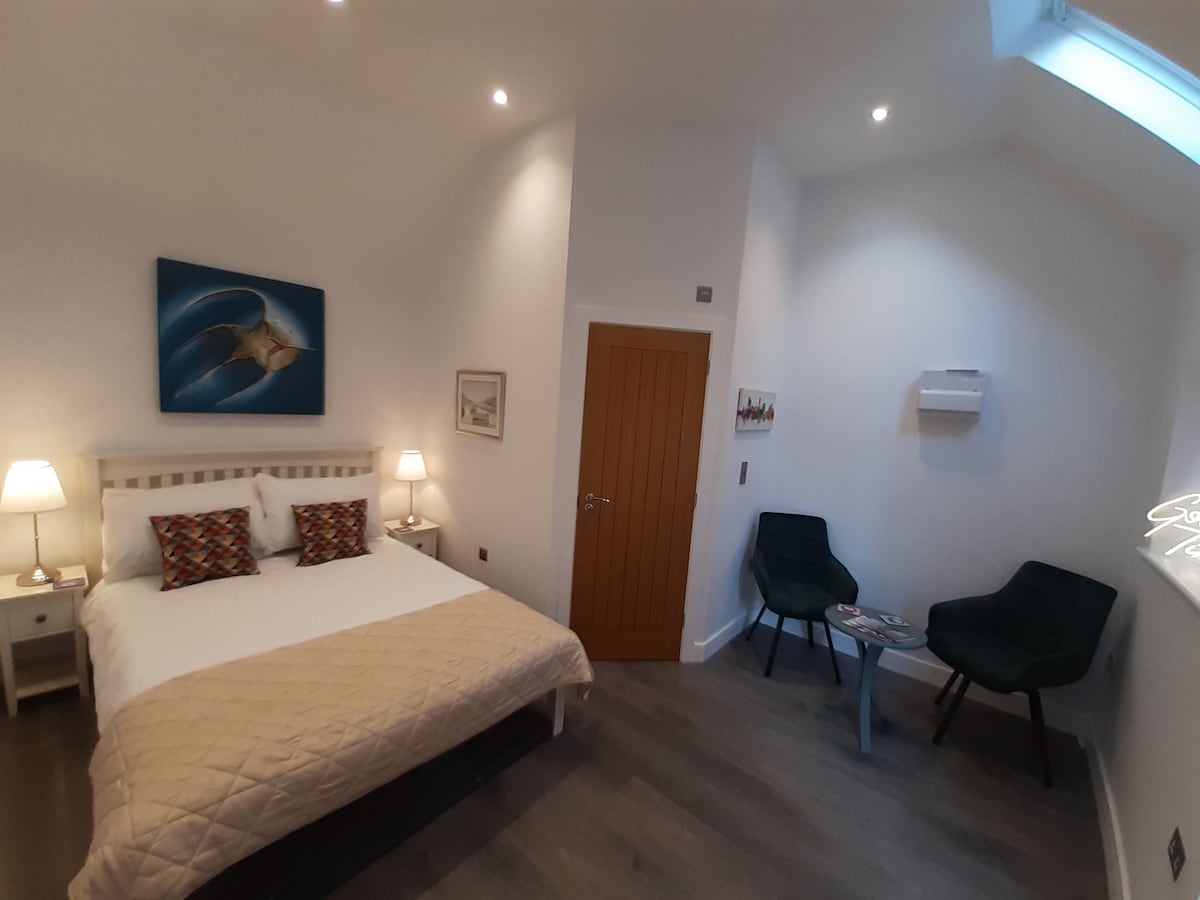 Estarás cómodo en nuestra casa, llena de carácter. Dos dormitorios en el piso de arriba, con una cama tamaño king y TV Freeview, y uno con cama individual (más camas en discusión); baño y ducha en el piso de abajo. Sala de estar en la planta baja con microondas, tostadora, hervidor de agua y nevera (sin congelador), sin fregadero de cocina. Pantalla (sin TV) disponible en la sala de estar con cable HDMI. Se proporciona servicio de lavado. Todo esto es para tu uso privado con tu propia puerta principal, en efecto una unidad independiente.