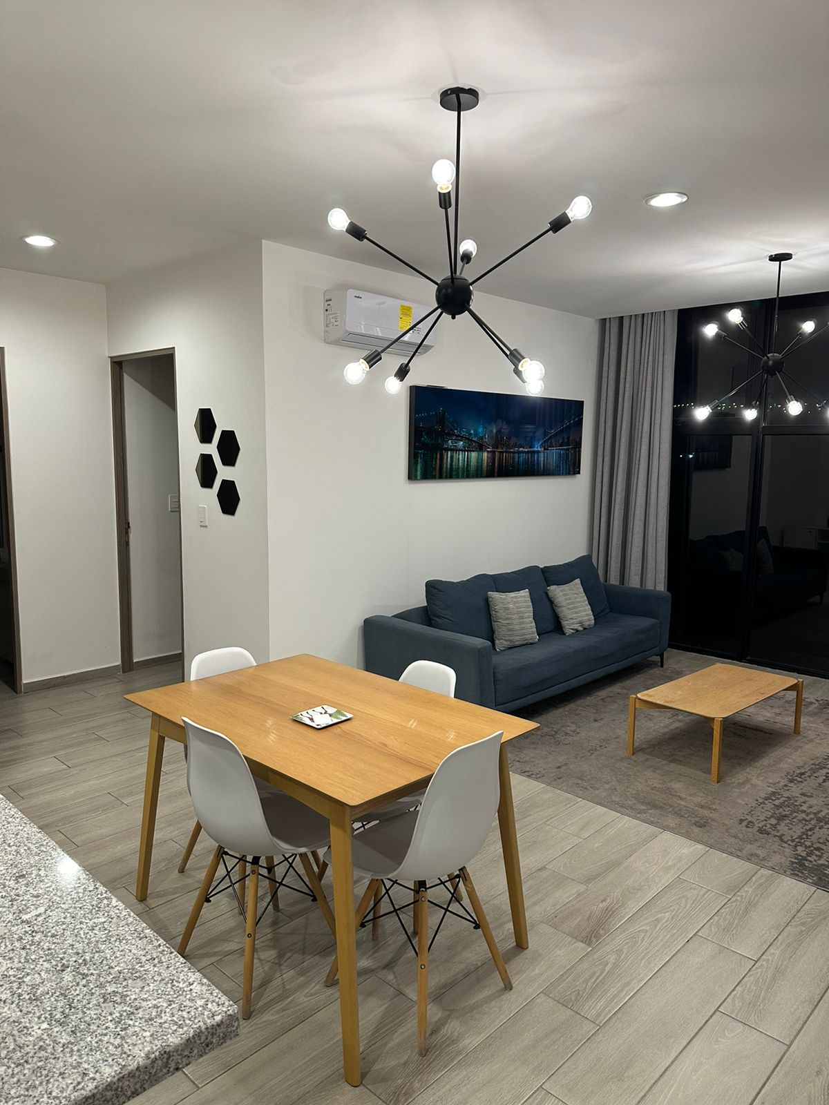 Disfruta de una increíble estancia en uno de los edificios mas bonitos de Querétaro, con muchísimas amenidades a las que pueden acceder cómodamente Departamento acogedor y elegante, con una decoración sofisticada y luces cálidas, es ideal para cenas románticas a la luz de las velas o noches de cine en pareja. Su diseño moderno y minimalista también lo hace apto para reuniones ejecutivas de pequeño formato El departamento cuanta con una cama matrimonial y baño completo para su uso!