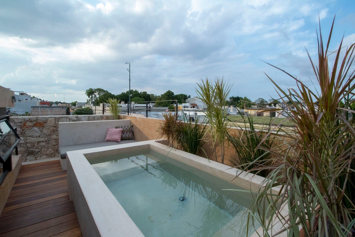 Depto, tipo Loft (doble altura) en complejo cerrado (1 de 5 deptos en total). Cuenta con area social, cocineta, 1 habitación y 1 baño sumamente moderno y práctico. Ideal para 2 personas cama queen y hasta 3 si se usa el sofa cama. Cuenta con estacionamiento privado, y automatizado, el depto es climatizado. A 10 min en auto al centro y paseo de Montejo. También a 10 min en auto del Norte de la ciudad, así como de hospitales como T1 Y Star Medica. centros comerciales cerca, plaza fiesta.