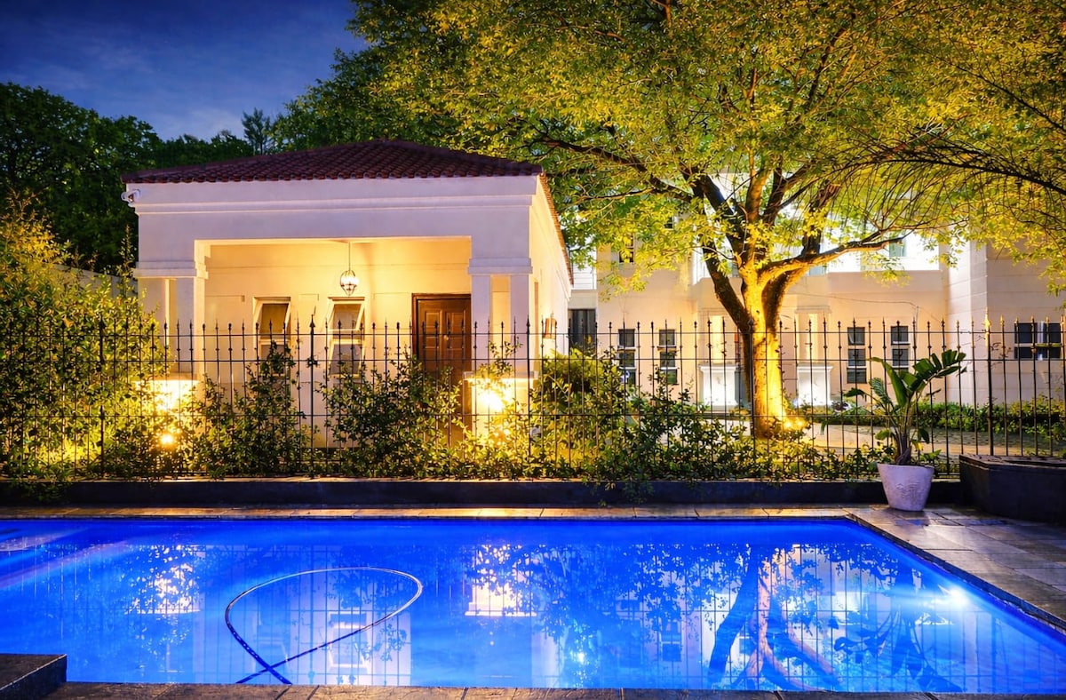 Sorprende a tu pareja con una escapada romántica. Sumérgete bajo las estrellas en tu propio jacuzzi privado, recién lleno solo para ti. Acurrúcate en lujosas sábanas de algodón egipcio, con mantas eléctricas, chimenea (bolsa de madera lista para ti), calefacción y aire acondicionado para noches acogedoras. Disfruta de Netflix, wifi rápido y una cocina totalmente equipada con Nespresso, café y bizcochos. Camina hasta un parque y restaurantes cercanos, o toma un Uber rápido hasta los mejores restaurantes de Joburg. Energía de respaldo, agua y seguridad en la calle las 24 horas, los 7 días de la semana.