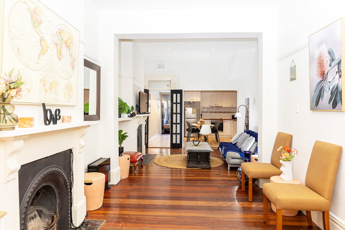 Esta histórica casa victoriana ofrece un alojamiento totalmente equipado. Tiene una ubicación ideal en el corazón de Darlinghurst, cerca de todo lo que ofrece Sídney. La zona es conocida por su vibrante escena cultural de galerías, cafeterías y teatros. Pasea por Hyde Park hasta el distrito financiero y disfruta de unas vistas impresionantes desde la ópera del Real Jardín Botánico. Cena a lo largo de Macleay St, Potts Point y Kings Cross. A solo 20 minutos de la famosa playa de Bondi y la bahía de Watson. Parada de autobús y tren a pocos minutos.