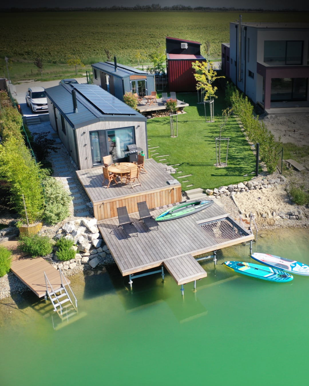 Come & relax in all seasons with the whole family or your friends at this amazing lakefront getaway. 'Escape on the lake' has it all! It is located on a private & leafy peninsula that stretches out into the Sunny Lakes, leaving you feel a million miles away, while conveniently located just minutes from the main resort with plenty of amenities, restaurants, cafes & shops, and only a 30min drive from Bratislava.