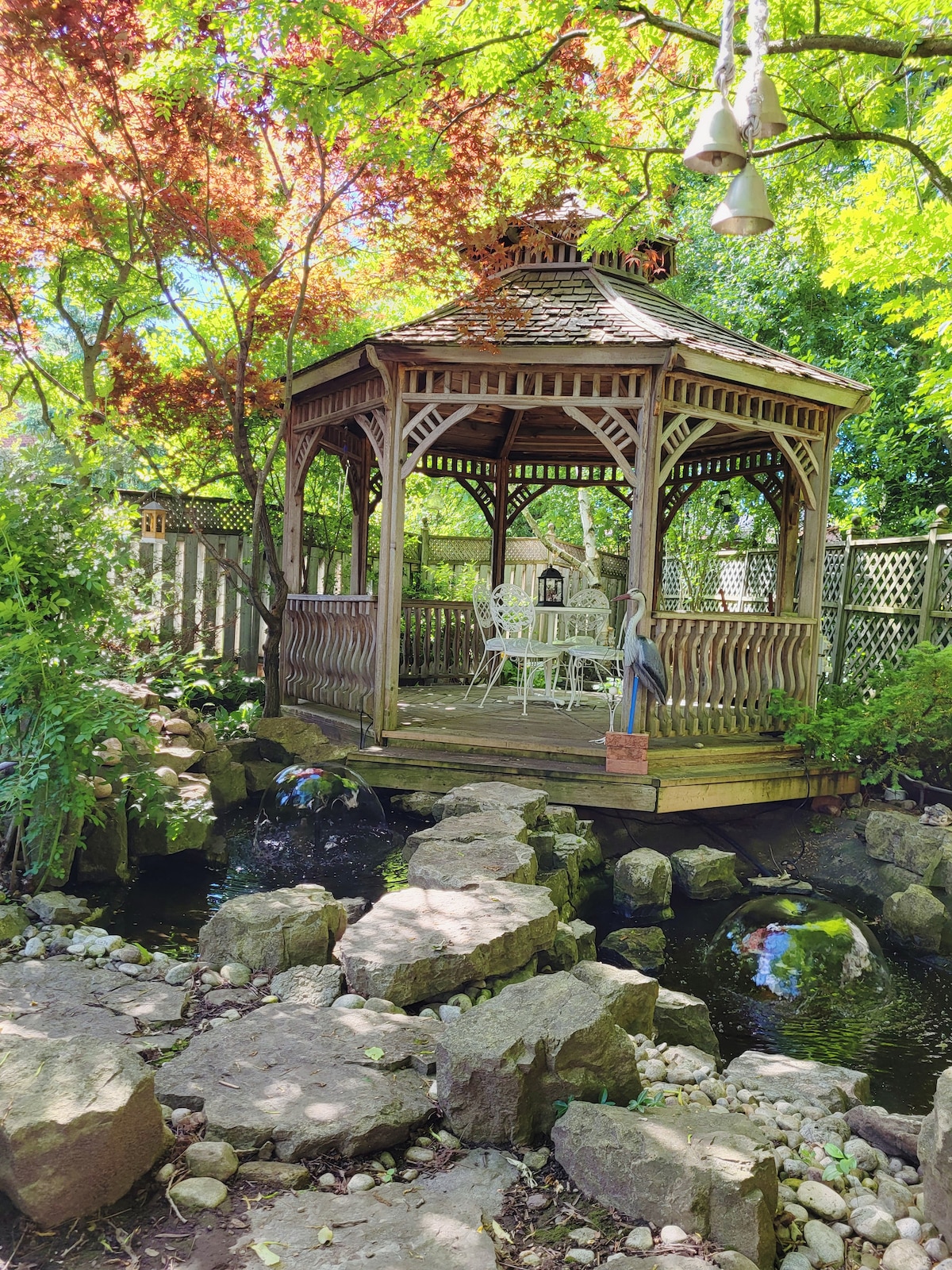 Experience a Stylish Garden Suite in a detached home. • Location: 15m to Pearson Airport, 30m to Rogers Centre, 1h to Niagara Falls. • Space: 2+1 Bedrooms (Sleeps 7: 2 queen beds, 2 single beds, 1 Full Sofabed), 1.5 Baths. • Amenities: Home theater, cozy fireplace, & fully equipped kitchen. • Convenience: In-suite laundry, 2 free parking spaces. • Outdoor: Designer garden with gazebo, fish ponds, and fountains. • No smoking/pets. The perfect blend of luxury and peace for families or groups.