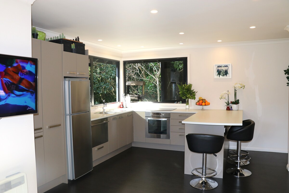 Nuestra suite independiente para huéspedes se encuentra en una calle tranquila y no muy lejos de las tiendas de Raumati Beach (a 3 minutos en coche/10-15 minutos a pie)... y tienes muchas opciones para elegir con cafeterías, panaderías, restaurantes, bares y una playa segura para nadar. Disfruta de tu privacidad y espacio propio con una pequeña cocina funcional con microondas y horno de sobremesa, la mejor presión de ducha de la historia, internet rápido para negocios o simplemente para ocio... o simplemente relájate con una película en Netflix.