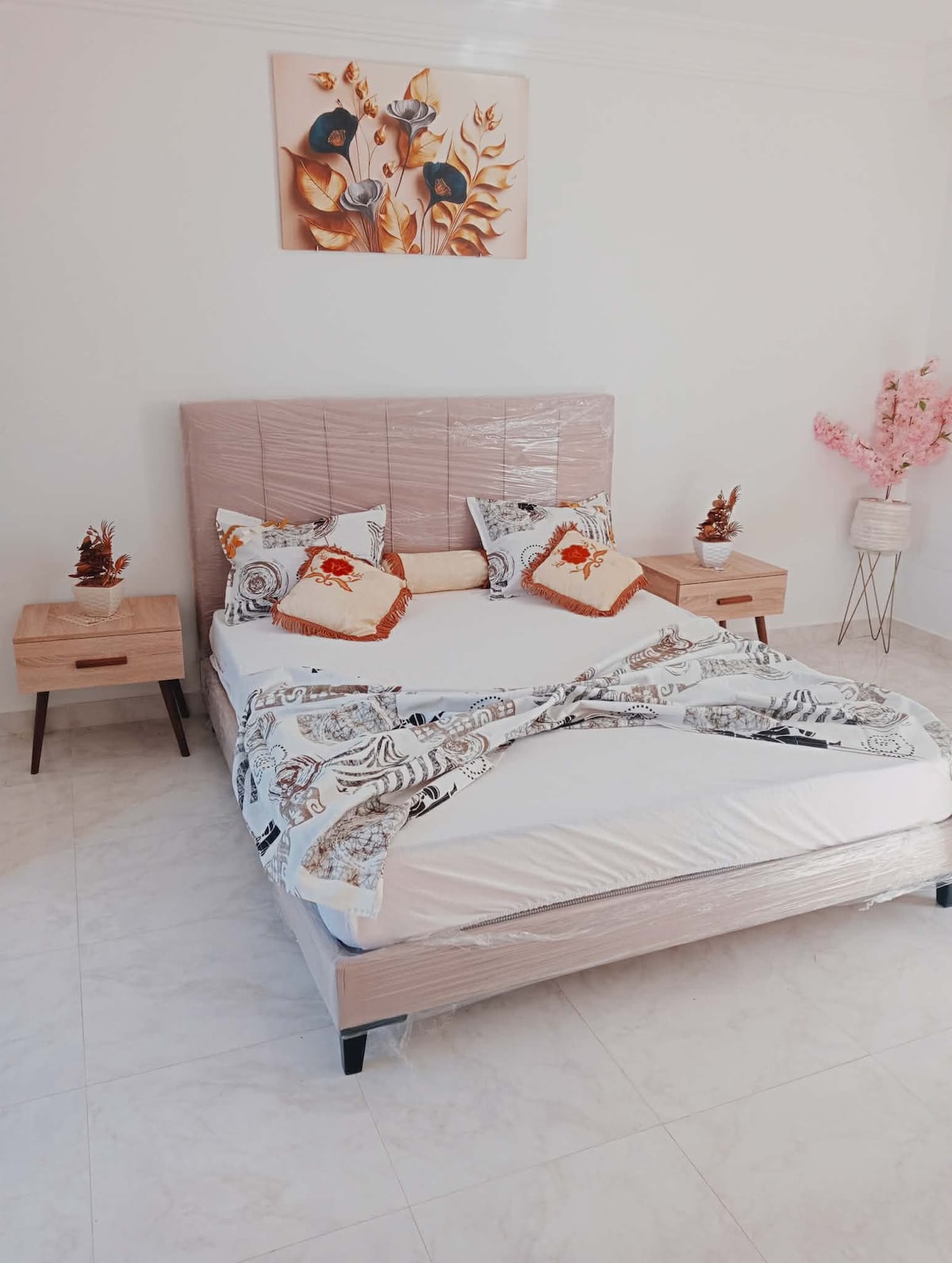 Le seul immeuble pied dans l’eau à Mahdia! ☀️ Résidence sable d’or collé à l’hotel Royal mansour. Le logement est fonctionnel et bien pensé, composé de deux chambres avec deux lits, parfait pour 4 personnes. Il ne dispose pas de salon, ce qui permet d’optimiser l’espace nuit et le confort des voyageurs. Vous profiterez d’une grande terrasse aménagée, avec une table pour déjeuner ou dîner face à la mer Au 1er étage avec ascenseur.