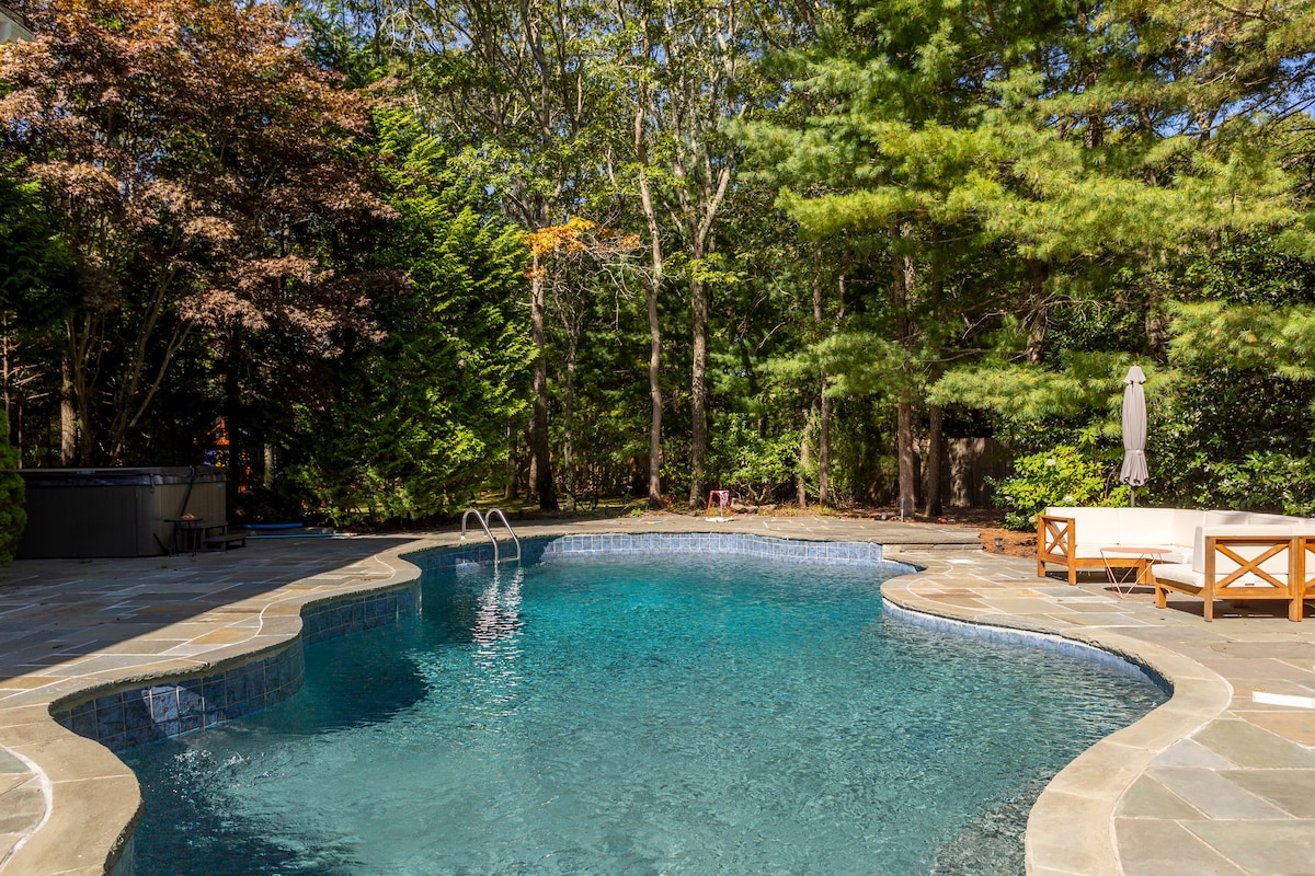 Situada en un terreno de media hectárea, esta residencia de diseño, actualizada y moderna ofrece una escapada tranquila y silenciosa a los Hamptons. 4 dormitorios maravillosos, 3 baños modernos y una piscina climatizada con energía solar y un paisaje maduro ofrecen una escapada relajante. Por favor, lee las divulgaciones, directrices y normas adicionales. No se permiten eventos, fiestas ni fumar.