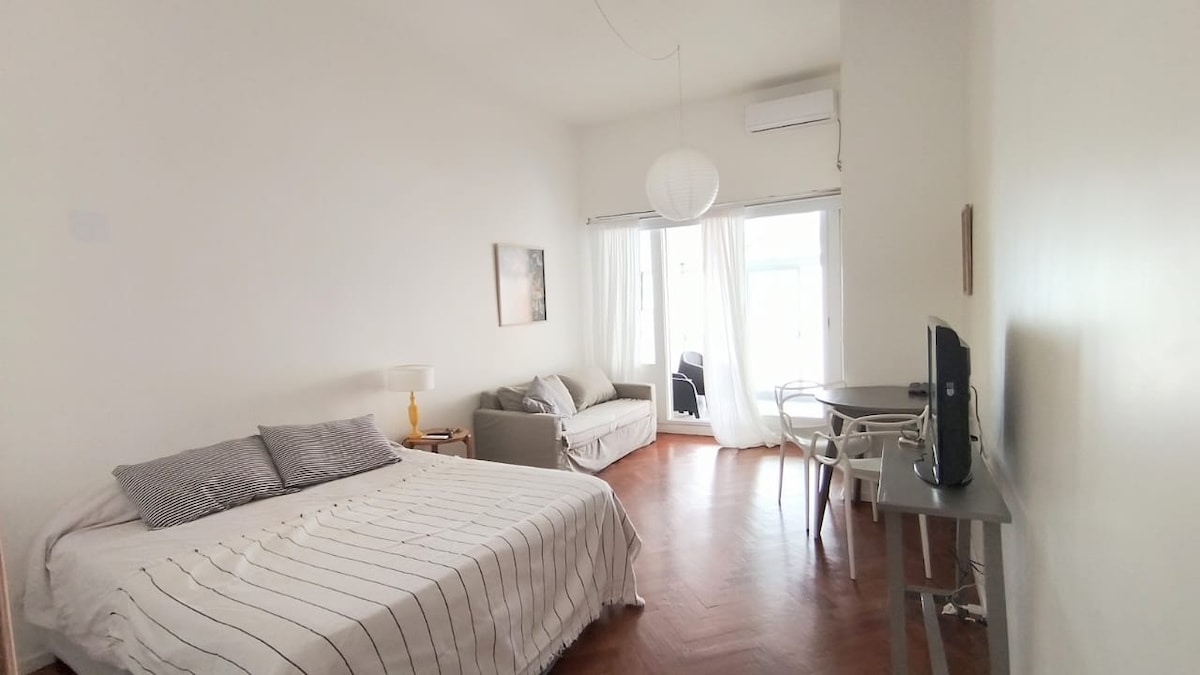 Departamento de diseño en inmejorable ubicación: Centro histórico de Buenos Aires. Remodelado a nuevo. Acogedor y luminoso. Ubicado en el piso 10, posee una excelente vista y balcón para fumadores Excelente área de servicios: restaurantes, mercados, bares, bancos (ATM) y transporte público (trenes, subtes, metrobus y buses) a menos de 5 minutos. Internet alta velocidad, WI-FI, smart TV con cable, camas modernas articuladas, toallas, toallones y equipamiento nuevo en todo el departamento.