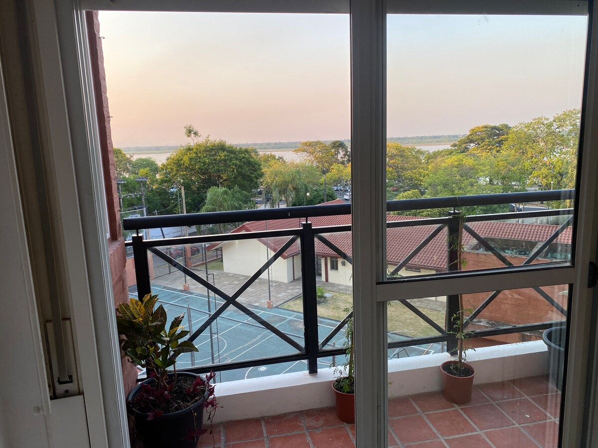 Disfrutá de una experiencia con estilo en este alojamiento céntrico a tres cuadras de la costanera, con balcón. Ultimo piso con terraza y solárium con vista al rio Paraná y quincho con parrilla. Un dormitorio con somier doble y sofá cama de dos plazas individuales. Instalaciones y decoración a estrenar todo nuevo!