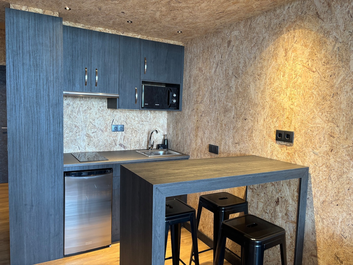 Forrado en madera con 1 cama y sofa cama, todo impecable en la zona de detrás de la piscina del club. Consulte nuestros otros apartamentos: www.airbnb.es/rooms/18665900 www.airbnb.es/rooms/18071106 www.airbnb.es/rooms/19047171 www.airbnb.es/rooms/19624592 y más...