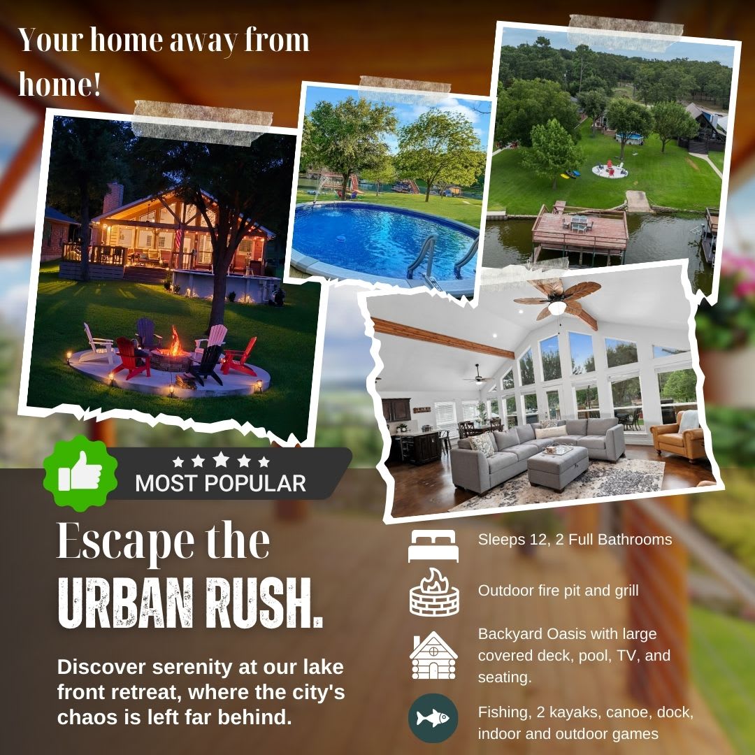 A place that is great for everyone. 3 bedroom 2 bath that sleeps 9 comfortably. Life can be busy, but at the lake house everyone comes together. These are the memories that will last a lifetime, and the stories that will be told and laughed about for decades. Enjoy campfires, S'mores, fishing and swimming on the lake, game night, sun rises, and so much more. With access to 150 ft of water frontage, two boat ports, a pool, high speed internet and a fire pit, the possibilities are endless.