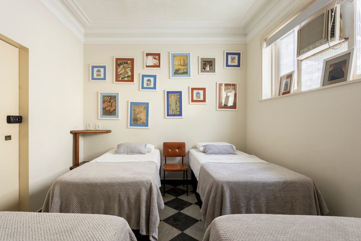 Room with 5 single beds and shared balcony. In a beautiful and renovated house. Located at the heart of Rio south side in a quiete and safe street. Close to the subway, shops, bars and restaurantes. Ceiling fan, full equipped kitchen and living room