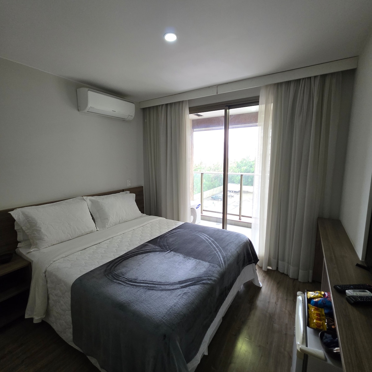 Hermosa SUITE con balcón, en una zona bucólica, cerca del gran Centro de Convenciones RIOCENTRO, te acomodará con comodidad y seguridad. Maravillosa cama king, ropa de cama y toallas de calidad, una ducha potente, espacio de oficina en casa, WIFI, aire acondicionado, microondas y cafetera. Infraestructura hotelera con jacuzzi, sauna, gimnasio, lavandería, pista de tenis, espacio para niños, piscina con carril para nadar, restaurante-bar para que tú y tu acompañante disfrutéis de una estancia perfecta.