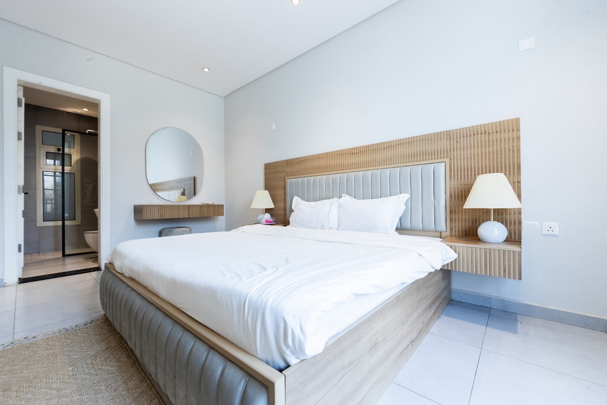 Relájate en este lujoso y tranquilo apartamento, que consta de un dormitorio tamaño king, una sala de estar con vistas a un jardín privado al aire libre, una zona de estar al aire libre y una cocina americana completa. Diseñado en estilo hotelero. Situado al norte de Riad, cerca de la temporada y los eventos de Riad, y a 15 minutos del aeropuerto internacional de Riad. Disfruta de un gimnasio gratuito, un salón público y una pasarela pública dedicada al complejo, incluido wifi gratuito. El servicio de lavandería tiene un cargo adicional.