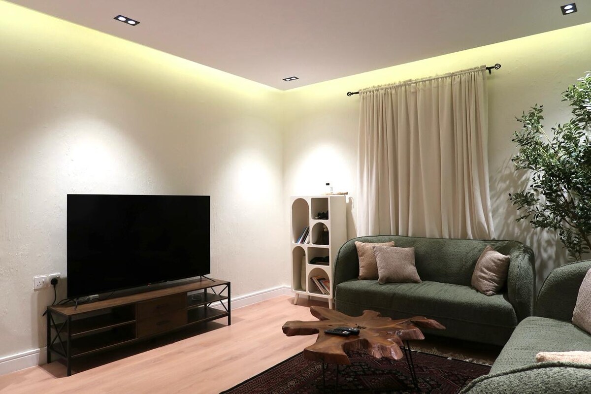 ¡Retiro estilo boho en Al Narjis! Acogedor departamento de 1 dormitorio con sala de estar, cocina equipada, 2 baños y una mesa de comedor para 4 personas. Las plantas naturales aportan frescura, y la iluminación suave y los tonos cálidos crean un ambiente relajante. Perfecto para personas que viajan solas, parejas o estadías cortas. Wifi rápido, aire acondicionado y estacionamiento incluidos. Disfrutá de la comodidad, el estilo y la tranquilidad de Riad en un espacio nuevo y acogedor.