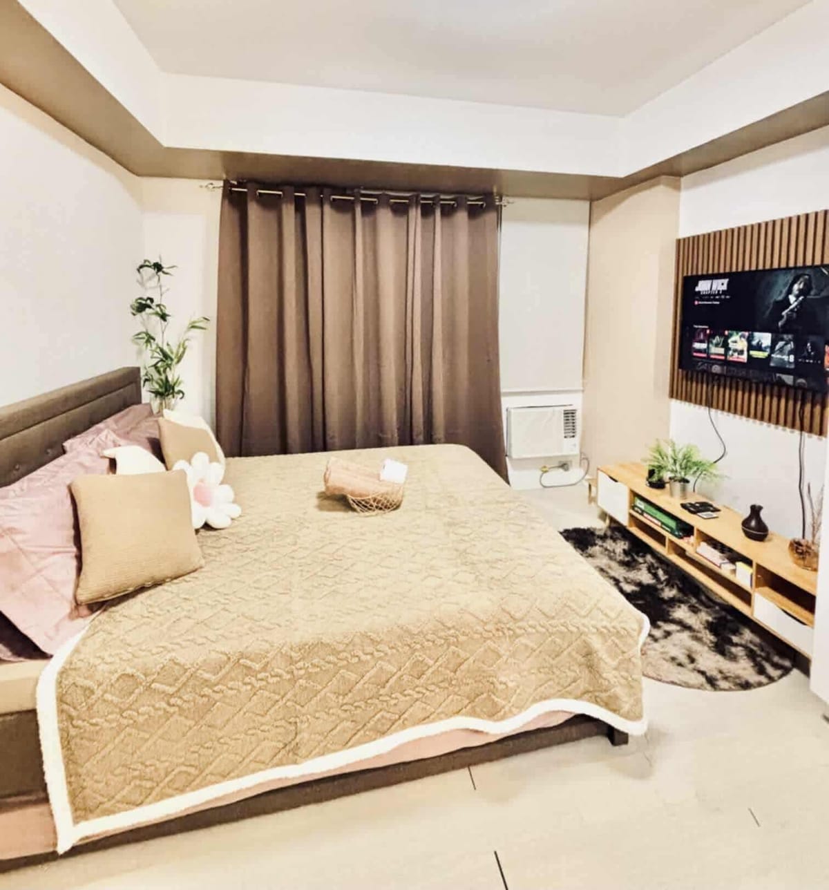 This cozy is 1bedroom loft at TWIN OAKS PLACE is centrally located at Greenfield District in Mandaluyong, directly across the Shangrila Plaza and just walking distance to SM MEGAMALL. Fully equipped with your modern essentials such as High Fiber Wifi, Premium Netflix & complete kitchen wares. This property is perfect for couples , small families and even business travellers. With both our 1 Queen Bed and 1Extra floor Queen matress, up to 4 Guests can be accomodated at any time.