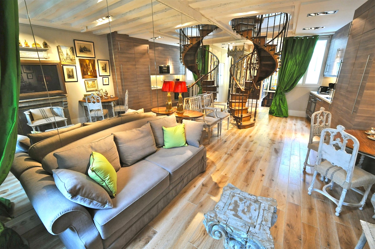 ¡Bienvenido a nuestro dúplex bajo los tejados, con aire acondicionado y unas vistas increíbles de Notre Dame y el Sena! Hay que subir 3 pisos a pie, ¡pero el balcón en el que desayunará admirando la catedral será su recompensa! Totalmente equipado y amueblado con antigüedades, nuestro apartamento tiene capacidad para 4 personas con una cama tamaño queen y un sofá cama muy cómodo. ¡Estamos muy disponibles para hacer que su estancia sea inolvidable!