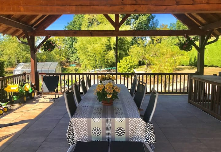 Grandes espacios cubiertos en el patio: el patio principal se encuentra junto a la piscina, con mesa de comedor para diez personas, hamaca, muebles de salón y barbacoa. Un segundo espacio de patio cubierto se encuentra en el lateral de la casa, con una mesa de desayuno. Amplios muebles de exterior están disponibles para crear otros asientos alrededor de los jardines.
