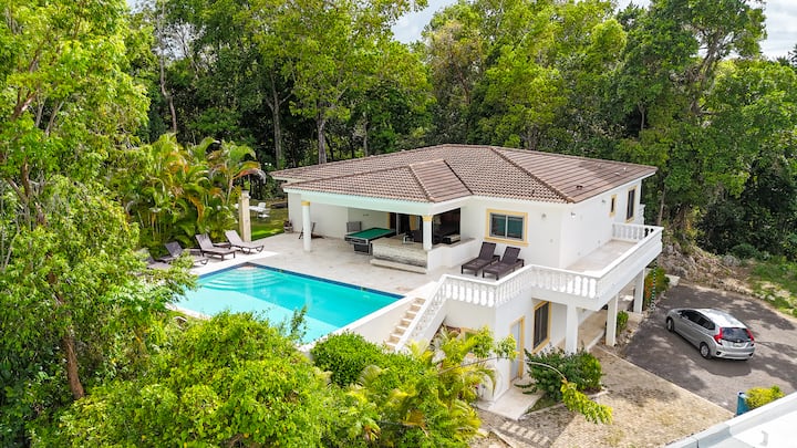 La villa cuenta con tres amplios dormitorios, cada uno con aire acondicionado, y una sala de estar recientemente redecorada amueblada para tu comodidad, completa con un televisor estilo cine para experiencias de entretenimiento únicas. La cocina está totalmente equipada con todos los utensilios necesarios para que tu estancia sea sencilla. Lo que realmente hace que esta villa sea magnífica es su gran terraza, que se completa con una mesa de billar, vistas al bosque y una espaciosa piscina. En esencia, esta villa es un oasis rodeado de naturaleza y privacidad, perfecto para relajarse y relajarse.