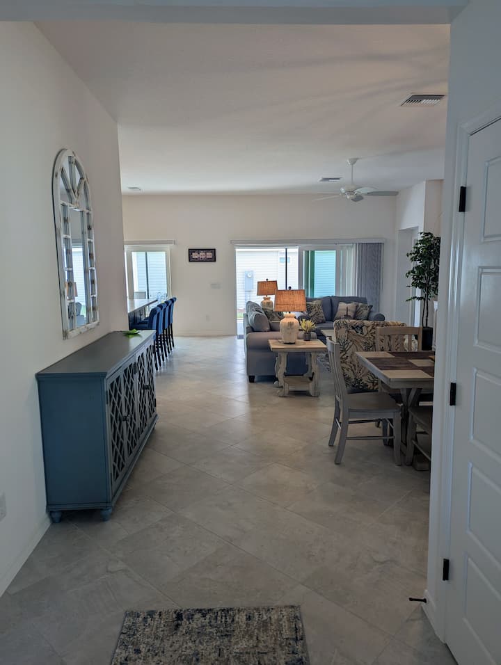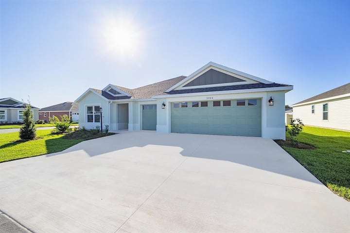 Esta casa de diseño de planta abierta del 2023 incluye una gran sala de estar con techos abovedados, tres dormitorios y tres baños, un garaje extragrande para dos coches + garaje para autos de golf, lavadora y secadora, lanai ampliado. La casa está a poca distancia a pie, en carrito de golf o en coche a una piscina para adultos, piscina familiar de estilo resort, centro recreativo del vecindario, gran centro recreativo, tienda de comestibles, alquiler de carritos de golf, campos de golf, deportes de raqueta y restaurantes. Edna 's on The Green, Fenney Grill y Brownwood Paddock Town Square están a 15 minutos en carrito de golf.