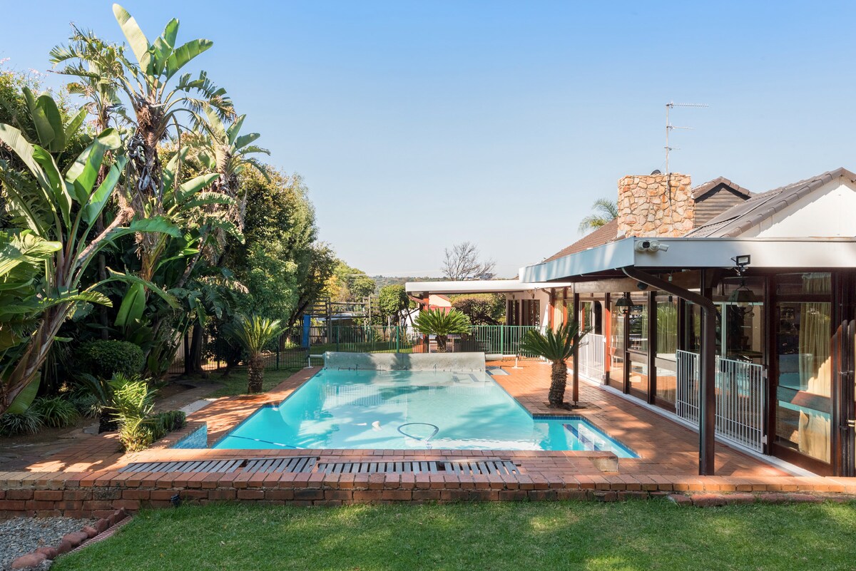 Solar powered battery inverter to escape load-shedding and forget your worries in this spacious, peaceful and centrally located place. A stone's throw from the best restaurants, shopping centres, sports facilities, and hospitals. Let the children play in the jungle gym and lush garden. Relax in the sauna and take a dip in a pool to cool down. Exercise at the gym and play pool. We look forward to welcoming you to our perfectly hidden getaway in the middle of bustling city landscapes.