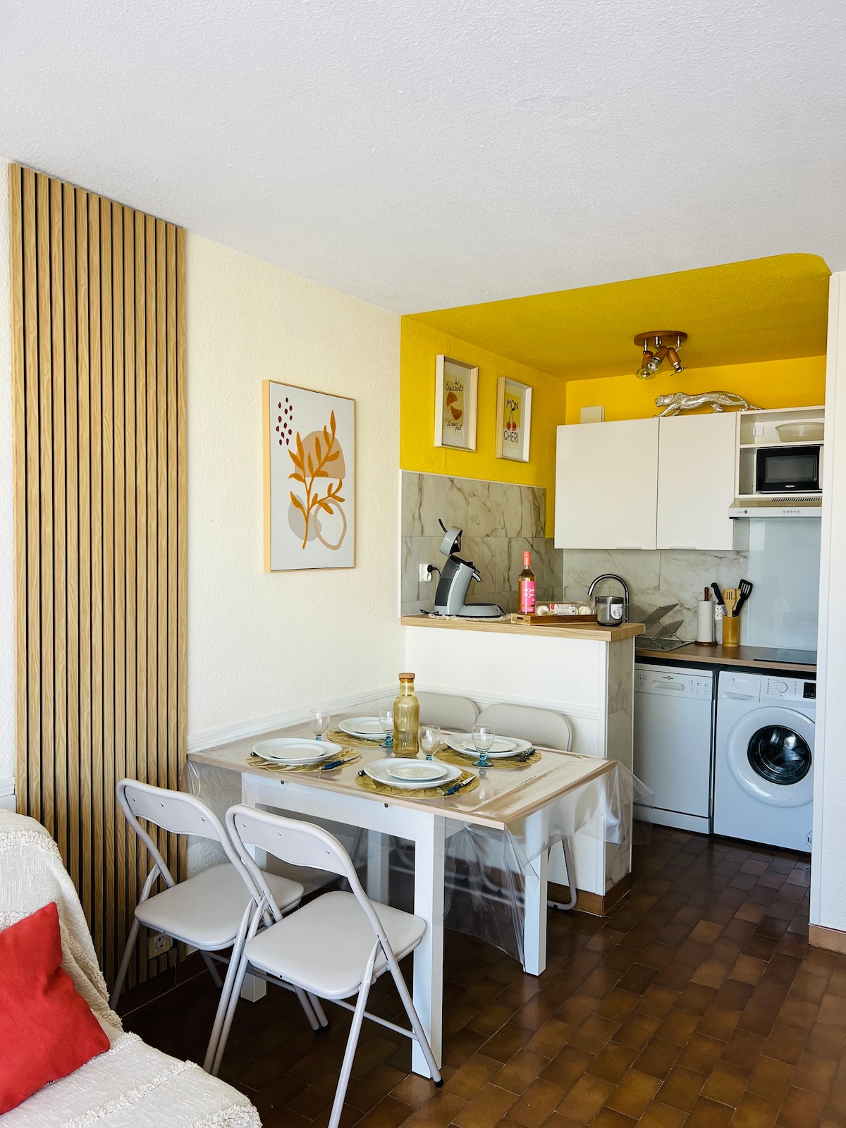 Encantador estudio luminoso frente al mar reformado. Increíble vista al mar desde el sexto piso. Situado entre el puerto y el centro de la ciudad de Canet. Balcón con terraza para comer frente al mar. También dispone de una mesa interior. Estudio con cocina equipada (cafetera, microondas, lavadora, placa de inducción) y el menaje de cocina necesario. Lado de la habitación; 2 sofás cama convertibles. Comercios cercanos (panadería, supermercado, estanco, restaurantes)