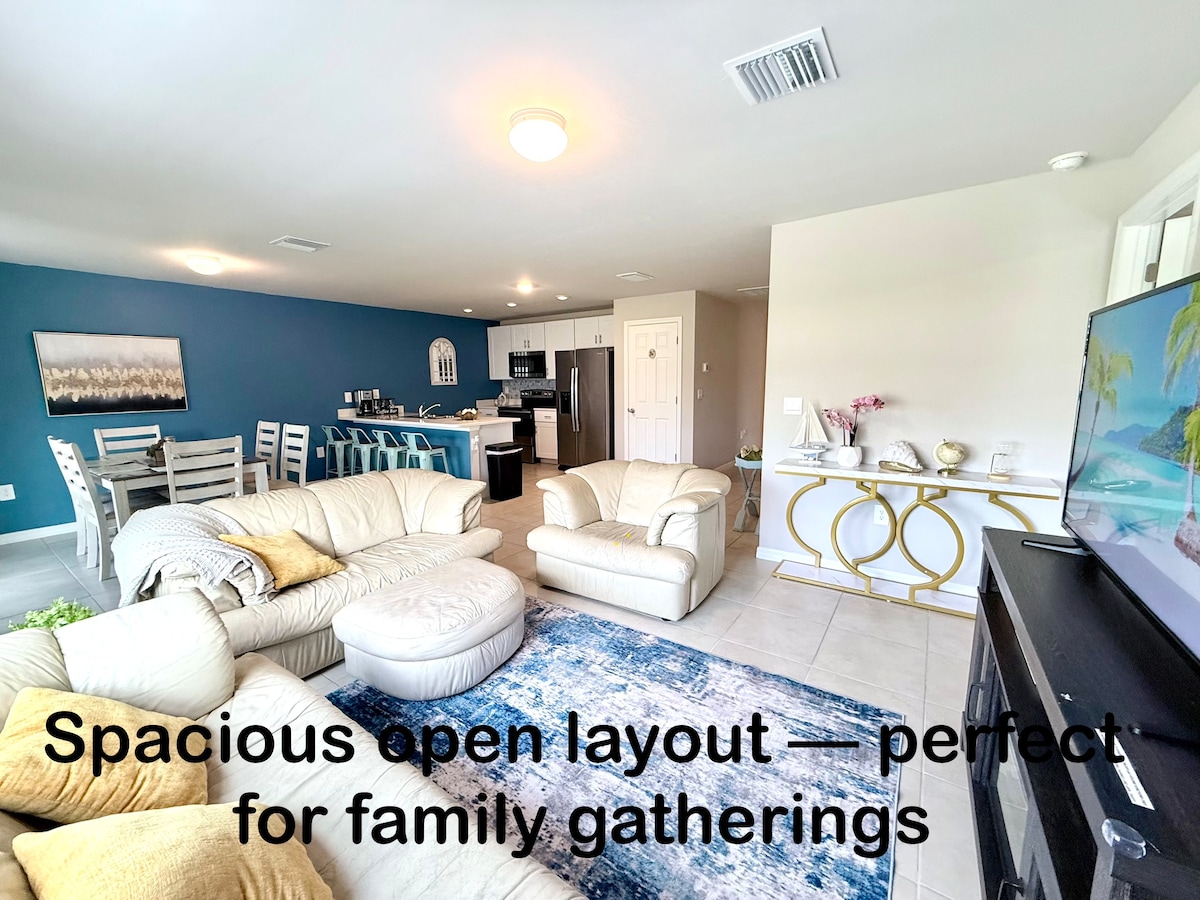 La sala de estar tiene un televisor inteligente de 65 pulgadas, montado en la pared con una chimenea LCD debajo con sonido envolvente. Todos los televisores tienen Netflix. La sala de bar tiene una nevera pequeña, mesa de billar y tablero de dardos. El exterior tiene un lanai privado con piscina climatizada y un fogón de propano. Disfruta del sonido de sonos con un televisor inteligente de 55 pulgadas en el dormitorio principal. El segundo dormitorio también tiene un televisor. La sala de bar también tiene sonido, así como el lanai. A 30 minutos de varias playas. El garaje no estará disponible. Casa ubicada en un tranquilo Cul de Sac.