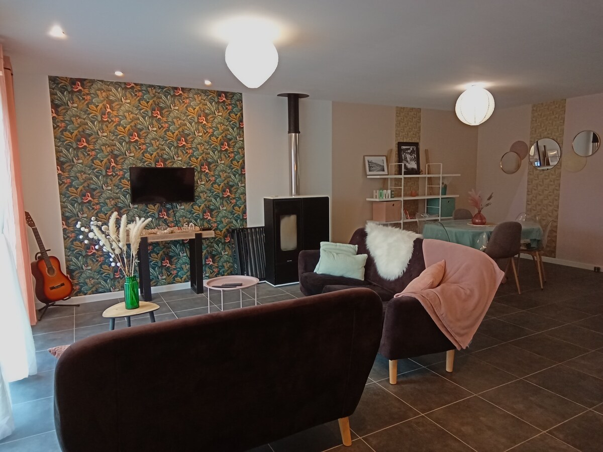 Casa nueva y confortable de 95 m² con un gran jardín vallado. Tranquila Cerca del lago, bosque, rutas de senderismo En la planta baja: un espacio abierto cocina, salón, SAM, zona de oficina (50 M2), SDB (ducha de hidromasaje) WC Arriba: dormitorio 1: cama doble, cama individual, cuna. Dormitorio 2: cama doble Altillo: cama individual. Zona de escritorio. Cuarto de baño (bañera) aseo. Jardín vallado. Gran terraza amueblada. Aparcamiento gratuito para 4 coches. Fibra WiFi para teletrabajo. Para viajeros, trabajadores. Ropa de cama y toallas opcionales