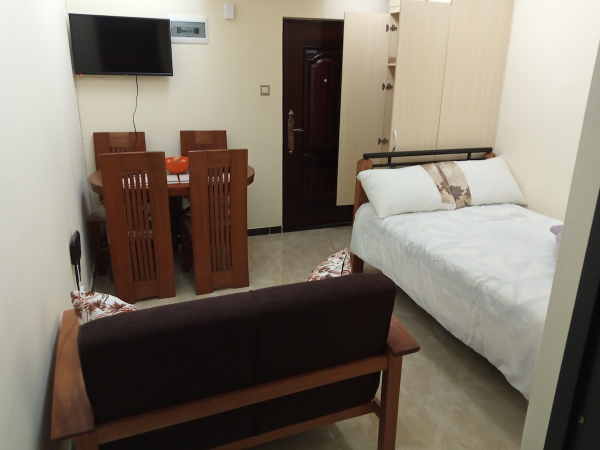 Este acogedor apartamento de un dormitorio totalmente amueblado se encuentra detrás del centro comercial Thika Road a lo largo de TRM Drive, a 3 minutos a pie del centro comercial, tenemos aparcamiento gratuito y seguro, wifi rápido y fiable, seguridad 24/7, a 10 minutos del hotel Safari Park, USIU y el estadio Kasarani, a 🏟 45 minutos en coche de JKIA a través de la carretera exterior. Tienes acceso a todos los elementos esenciales, restaurante local, comestibles, servicios en línea, karibu mágico. 🇰🇪